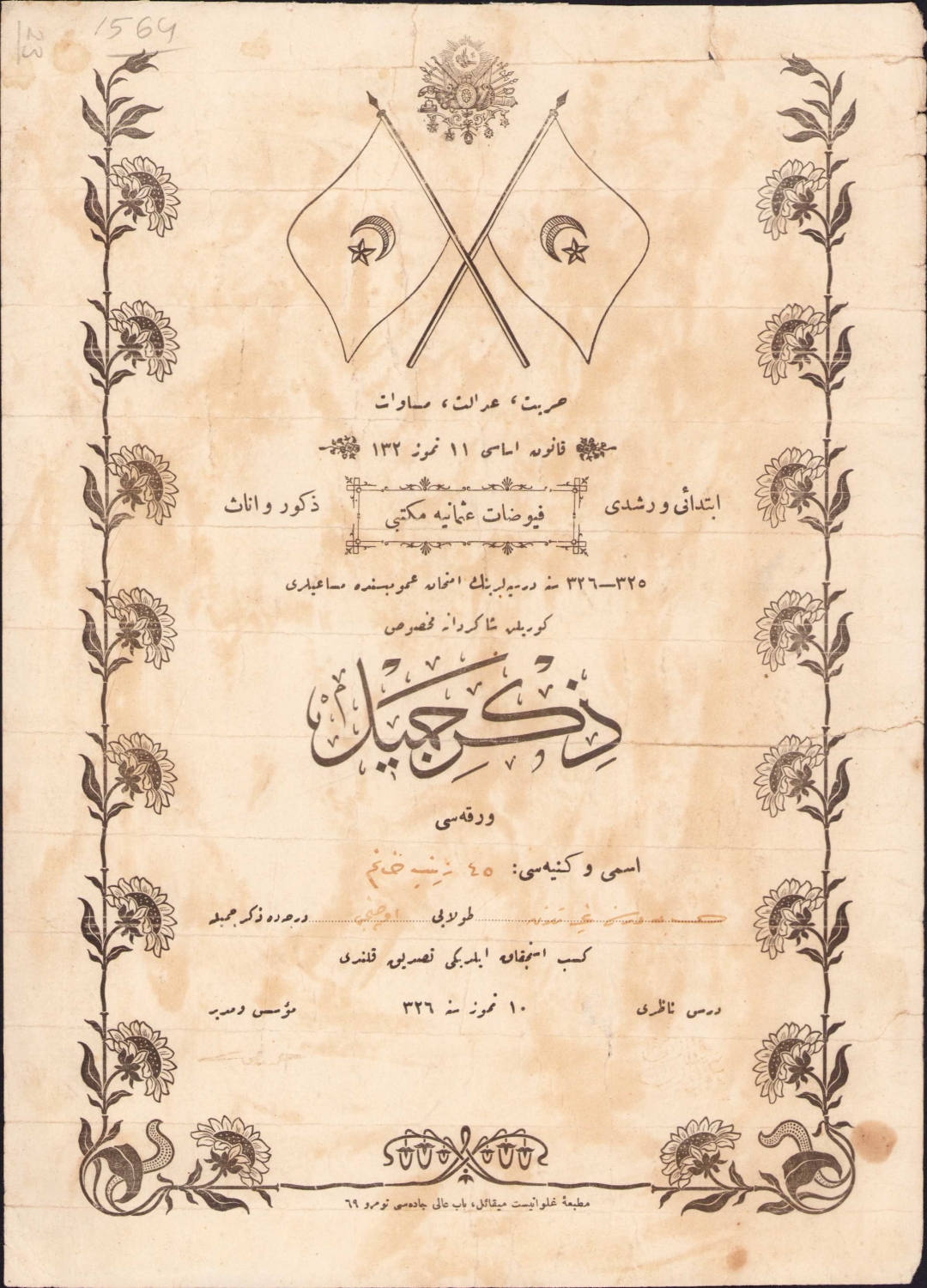 Füyüzatı Osmanlı Mektebi Zikri Cemil Varakası, 1326 tarihli, çift bayrak görselli Hürriyet, Adalet, Musavat yazılı, 20x28 cm