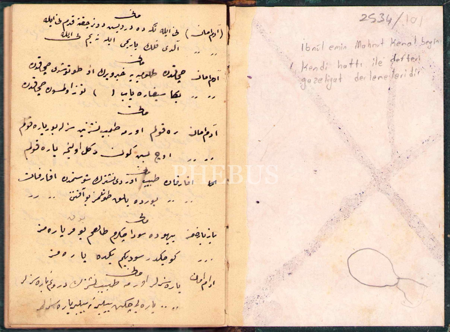 İbnü'l-Emin Mahmud Kemal Bey'e ait; kendi el yazısı ile gazeliyat derlemelerini içeren el yazması defter[44 sayfa], İbn-ü'l Emin'in bir fotoğrafı ve kardeşi Seyyit Ahmet Tevfik Bey'in fotoğrafı ve tuğralı cildinde kendi sicil-i ahval defteri [3 sayfa]