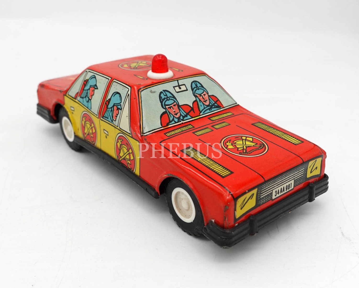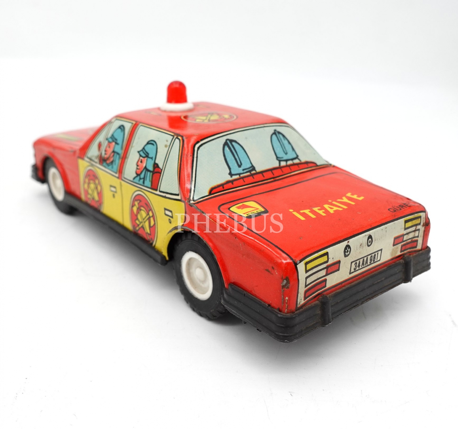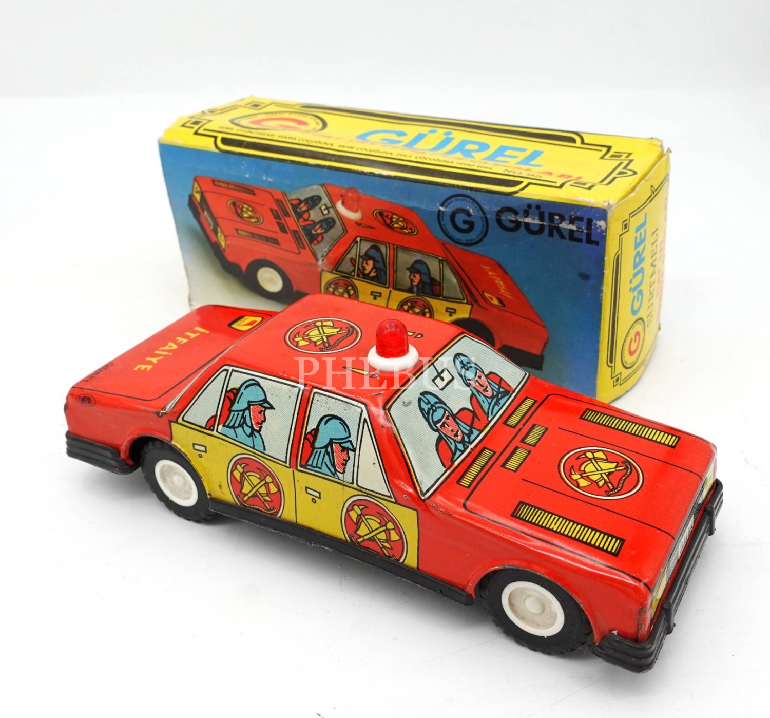 Türk malı, Gürel marka, kutusunda kırmızı tepe lambalı Fiat itfaiye arabası, 17x8x6 cm