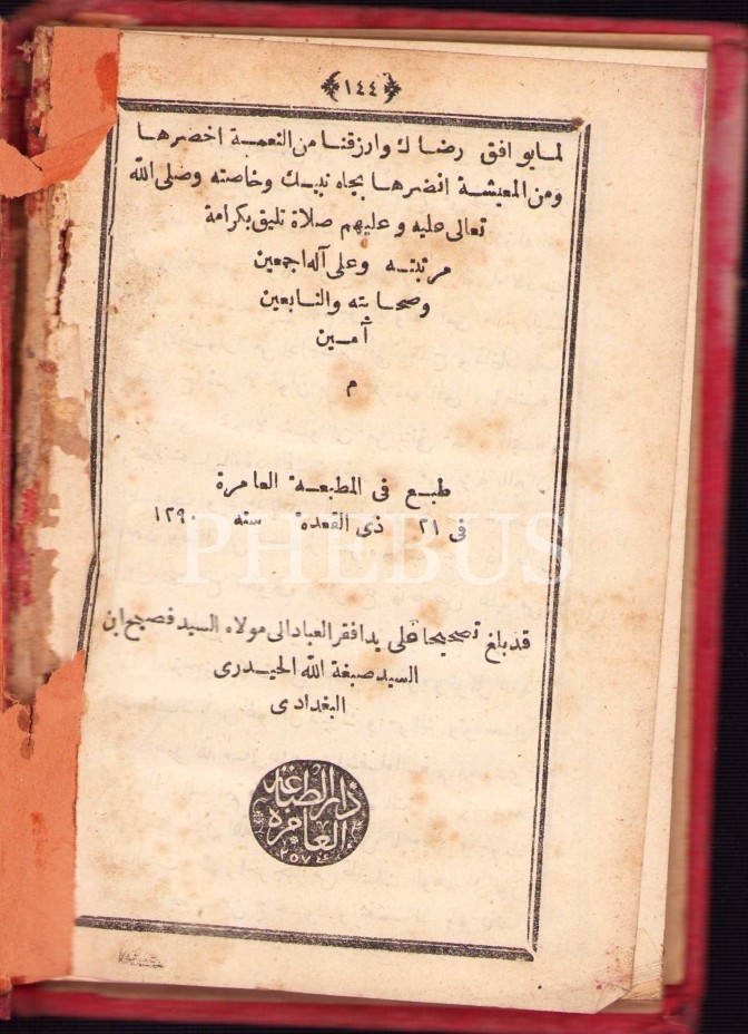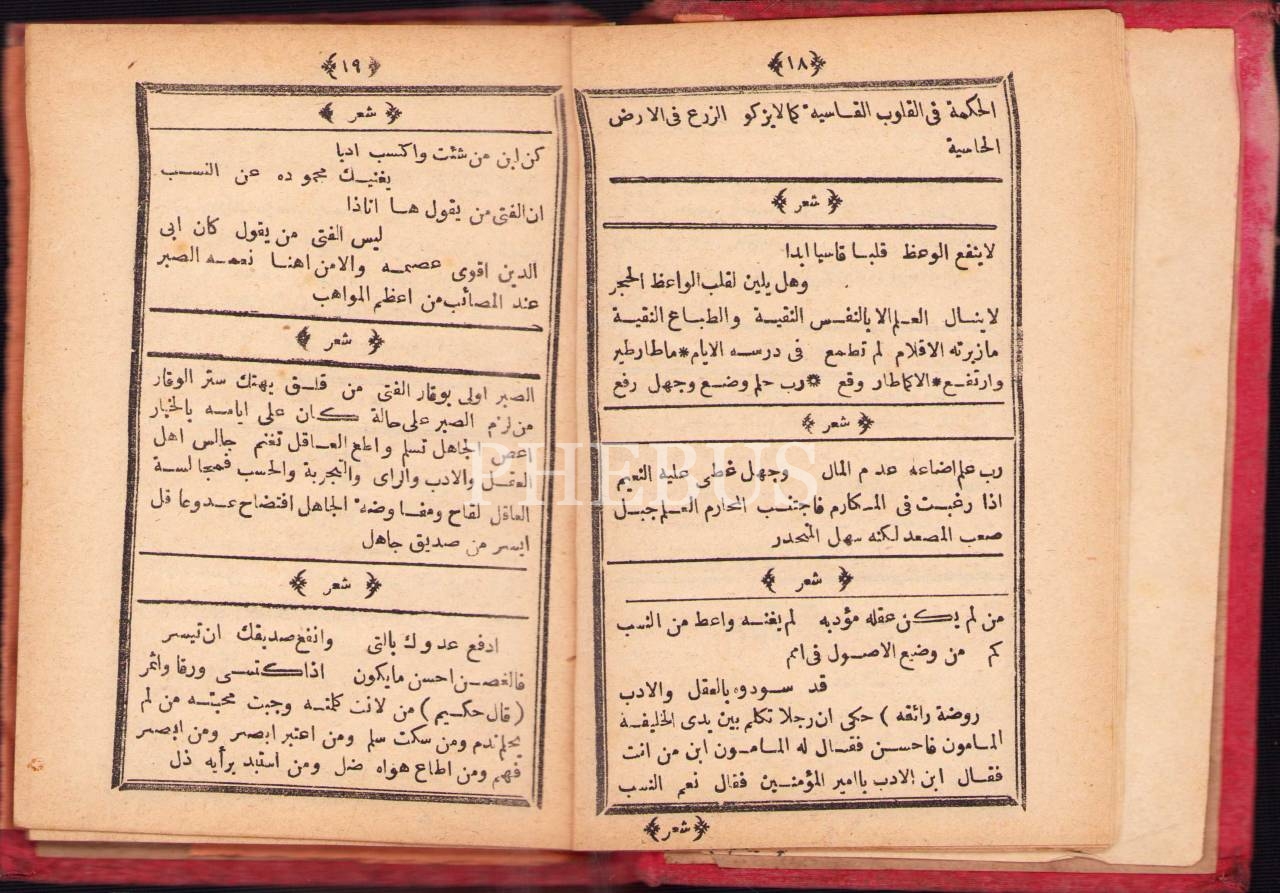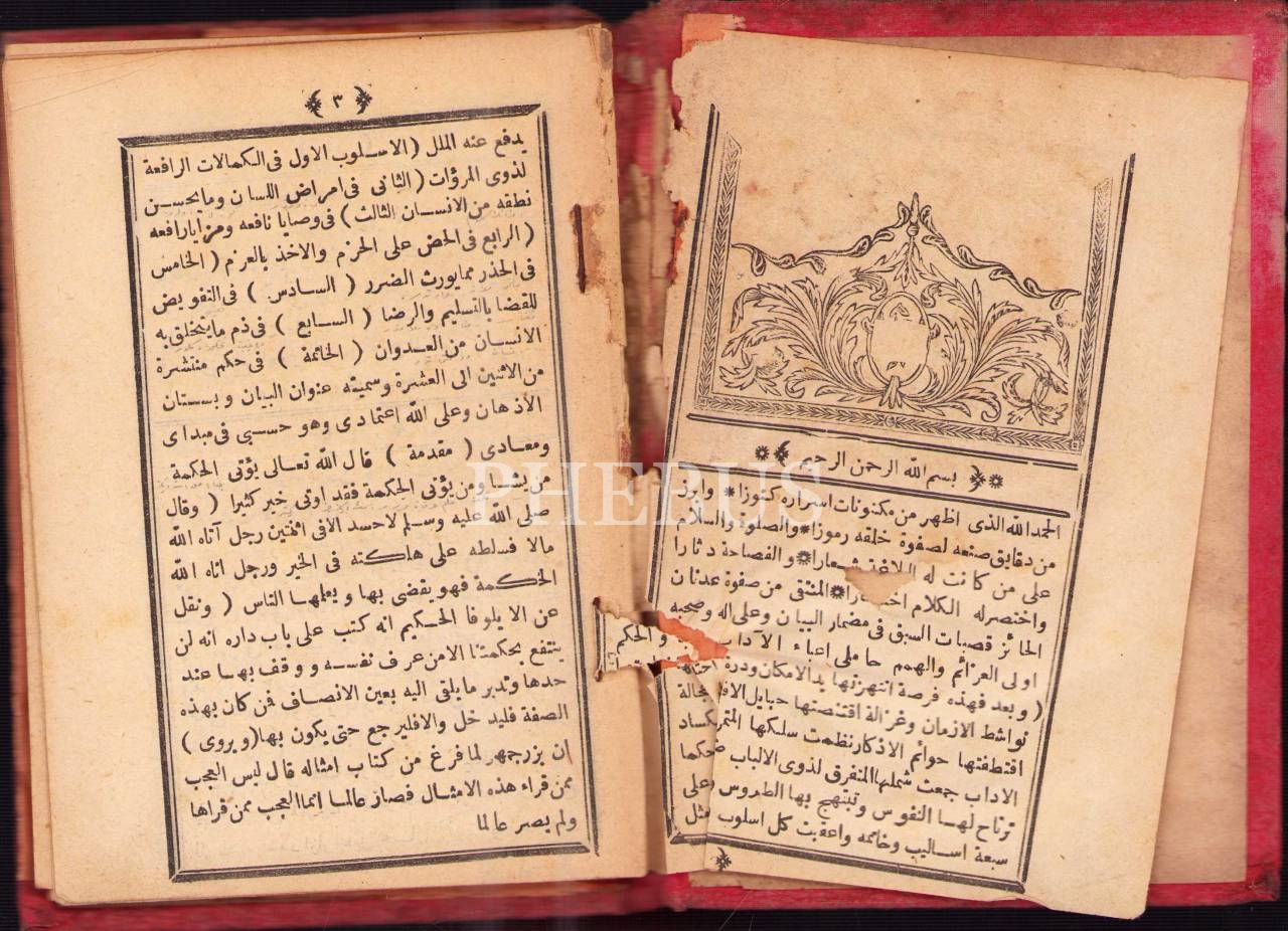 Osmanlı tuğralı ve ay yıldızlı cildinde Arapça UNVÂNU'L-BEYÂN VE BUSTÂNU'L-EZHÂN VE MECMÛ-I NESÂYİH Fi'L-HÜKM, Amire Matbaası, 1290, 144 s., 12x18 cm