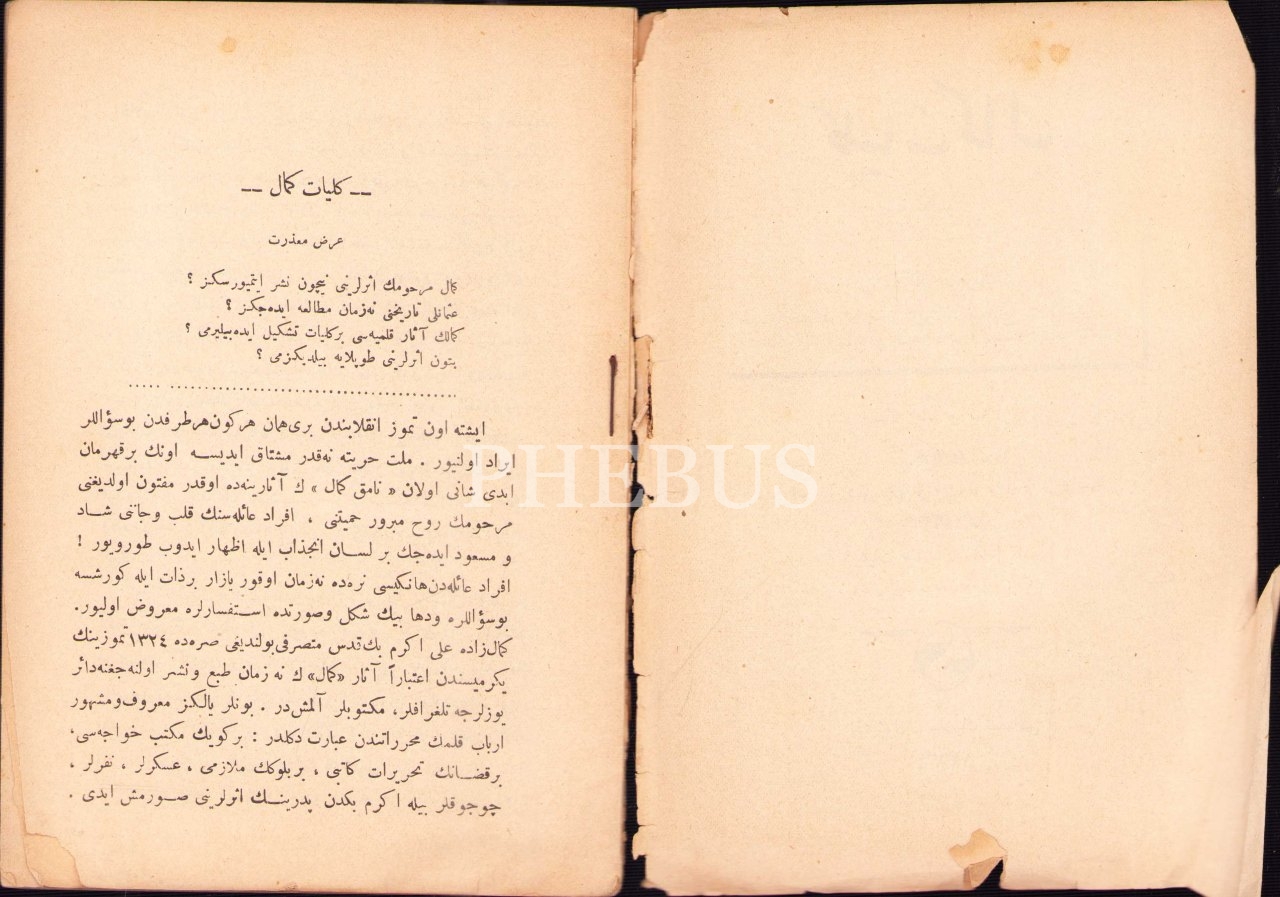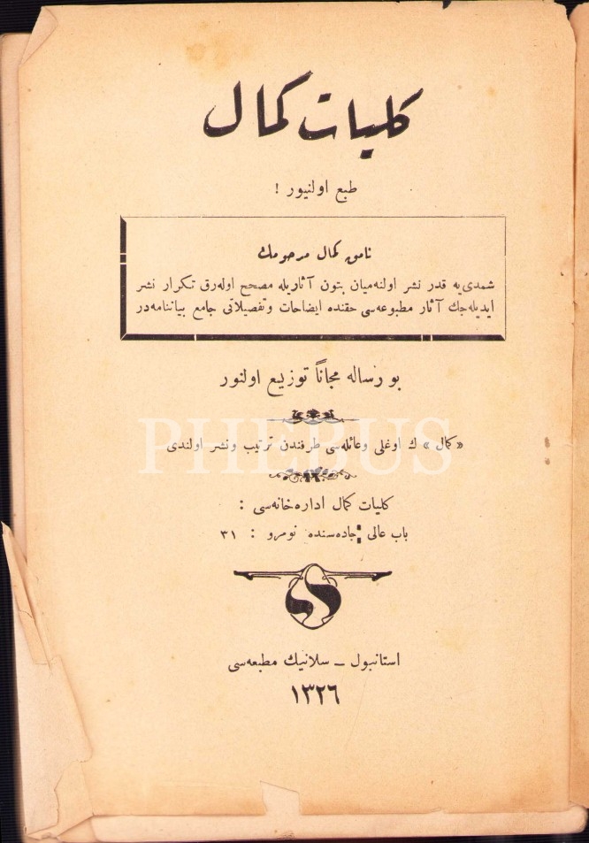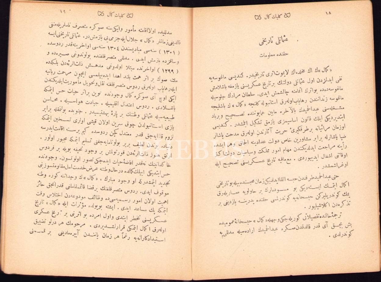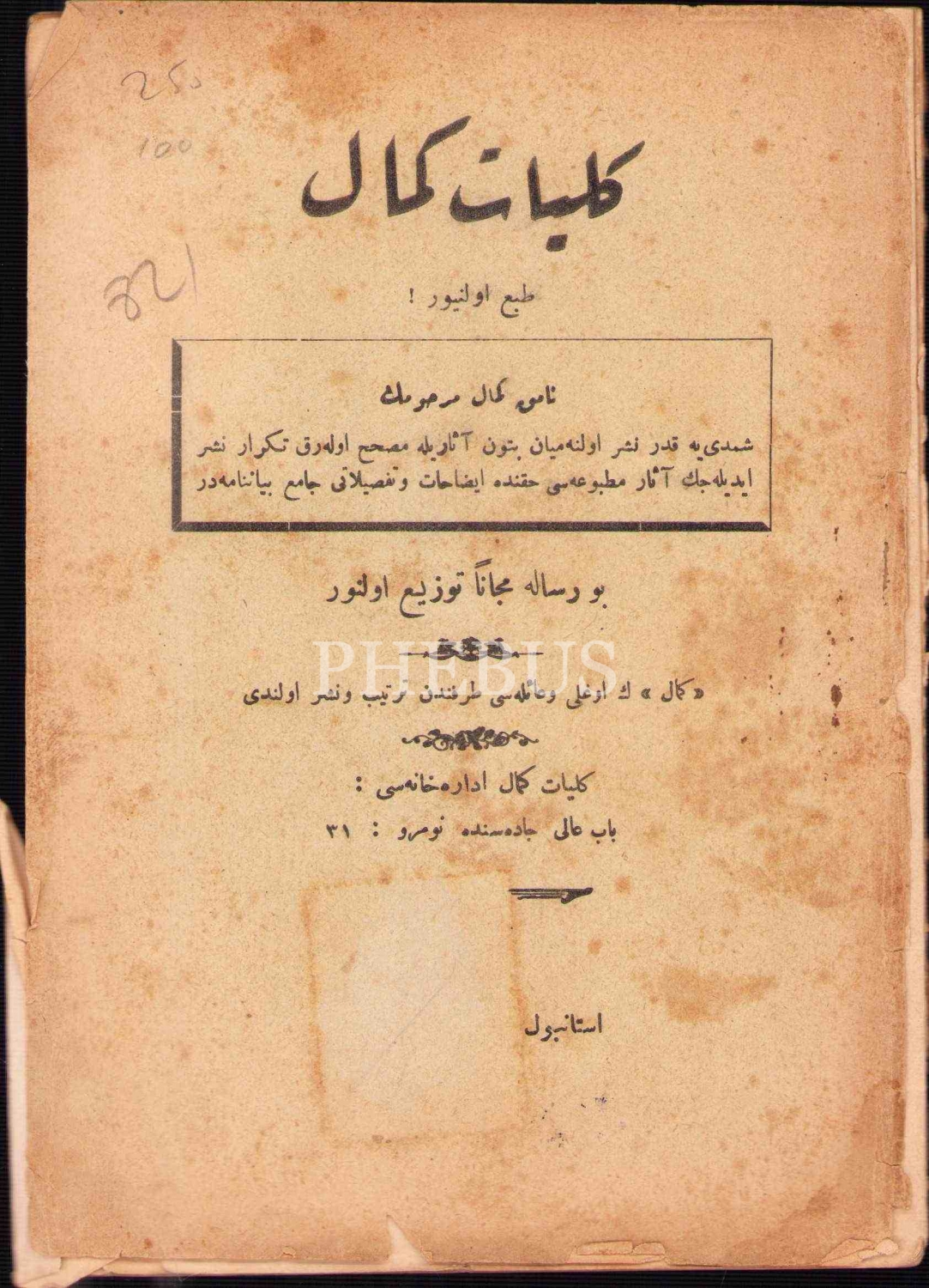 KÜLLİYYÂT-I [NAMIK] KEMÂL, Selanik Matbaası, İstanbul 1326, 64 s., 13x19 cm, kapak sayfası ayrık haliyle