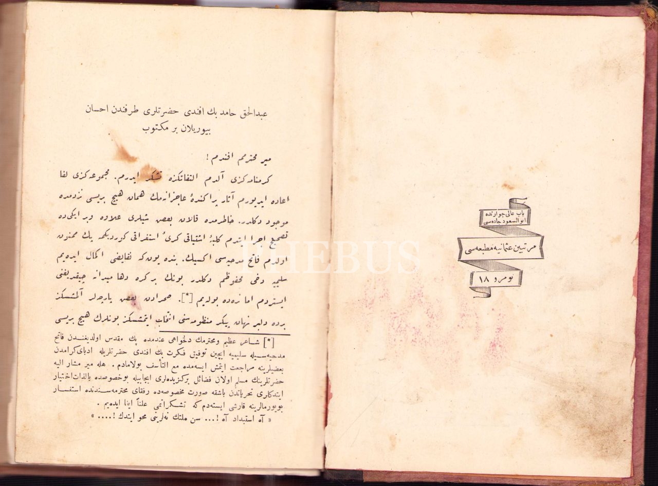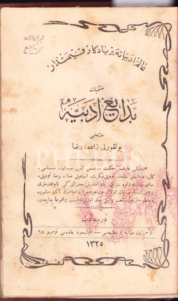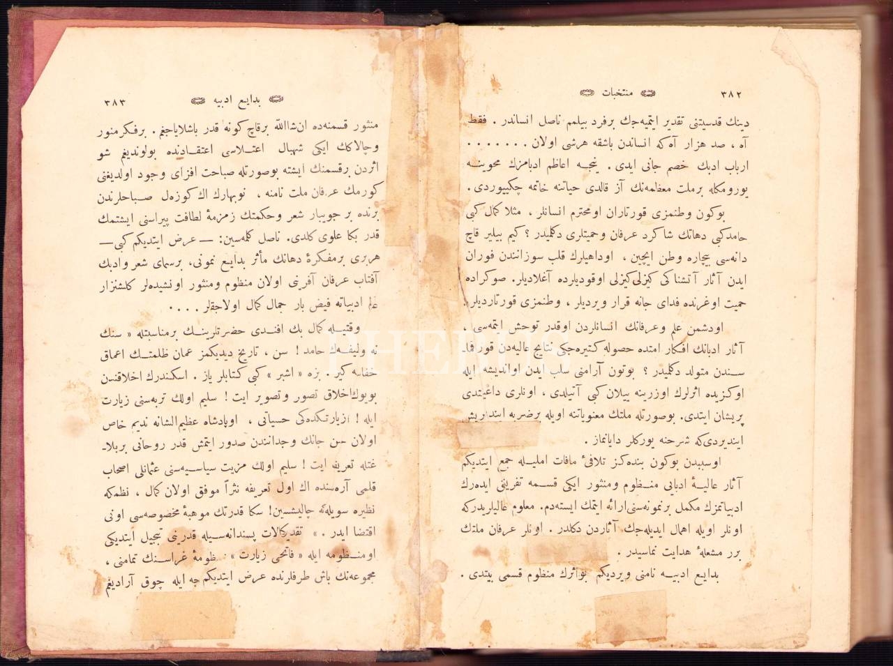 MÜNTEHABÂT-I BEDÂYİ-İ EDEBİYYE [Seçki], derl. Bulgurluzade Rıza, Mürettibin-i Osmaniye Matbaası, Dersaadet 1325, 384 s., 14x20 cm, birkaç sayfası tamirli haliyle