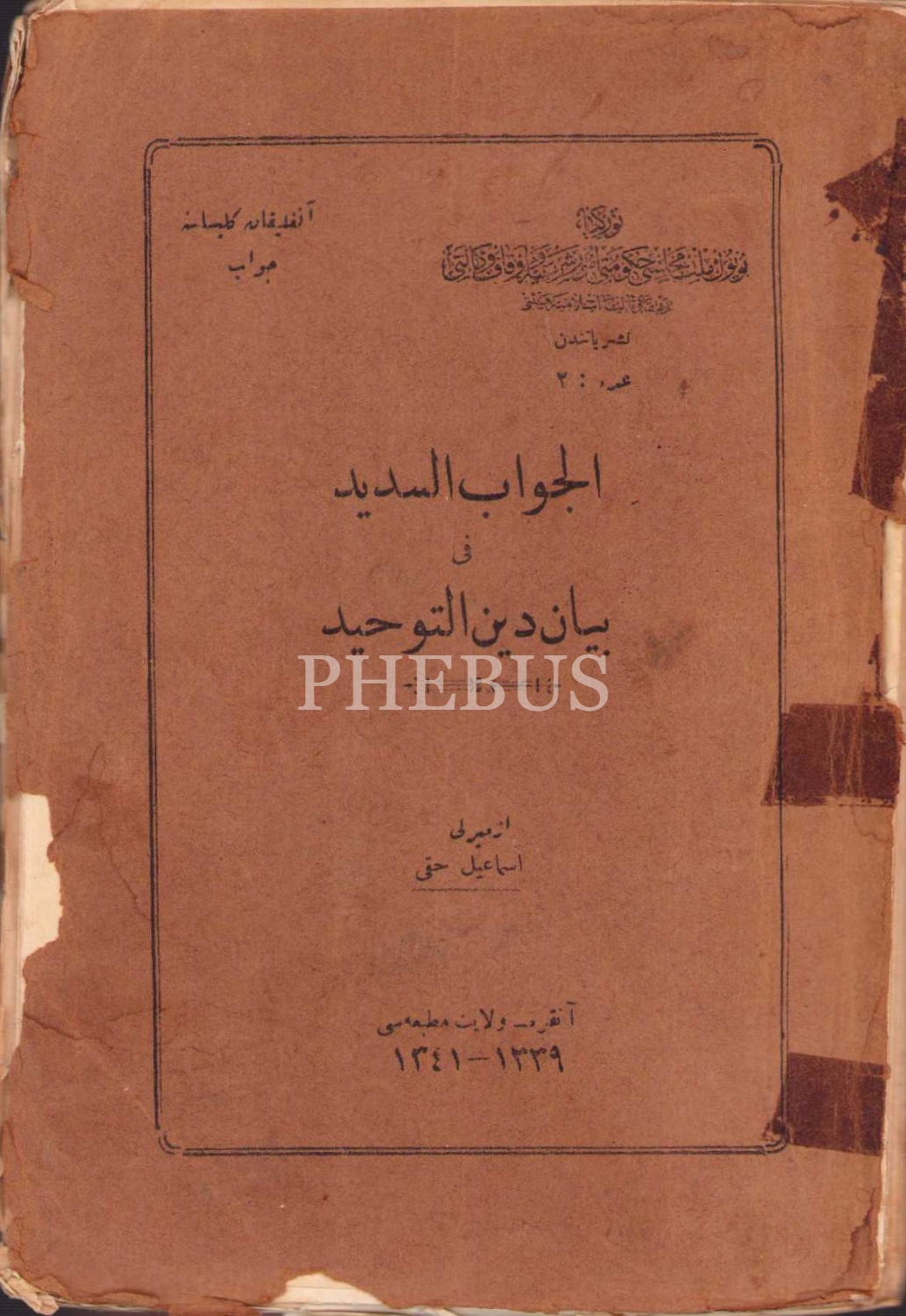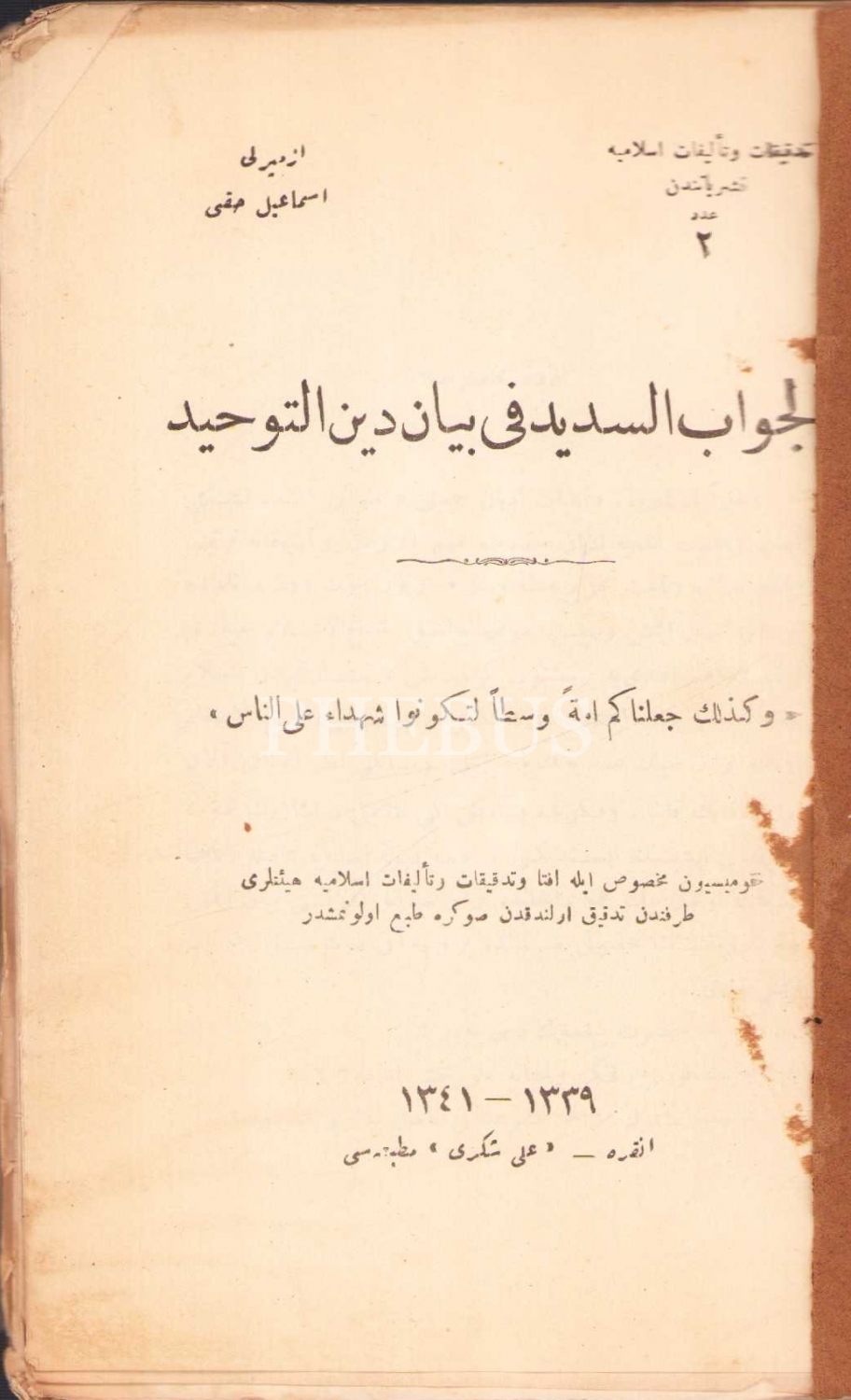 EL-CEVÂBÜ'S-SEDÎD FÎ BEYÂN-I DÎNİ'T-TEVHÎD (Anglikan Kilisesine Cevâb), İzmirli İsmail Hakkı, Ankara Vilayet Matbaası, 1341, 278 s., 14x21 cm, formaları kısmen ayrık haliyle