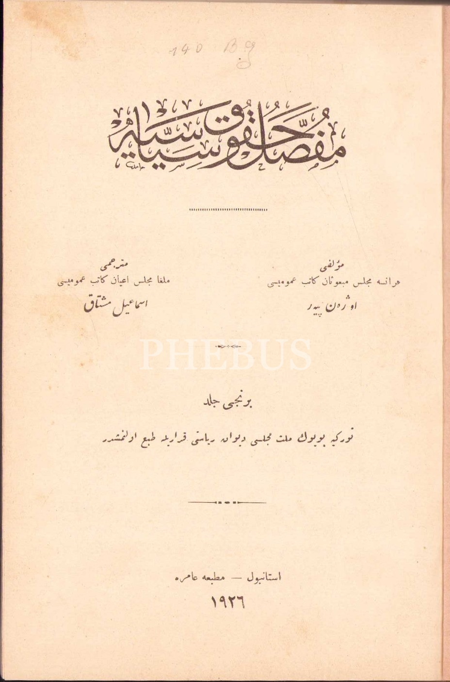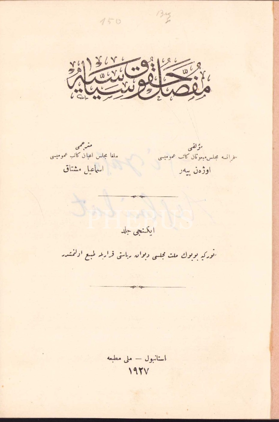 MUFASSAL HUKÛK-I SİYÂSİYYE [2 Cilt], Eugene Pierre, çev. İsmail Müştak, Amire Matbaası ve Milli Matbaa, İstanbul 1926-27, 888+840 s., 17x24 cm