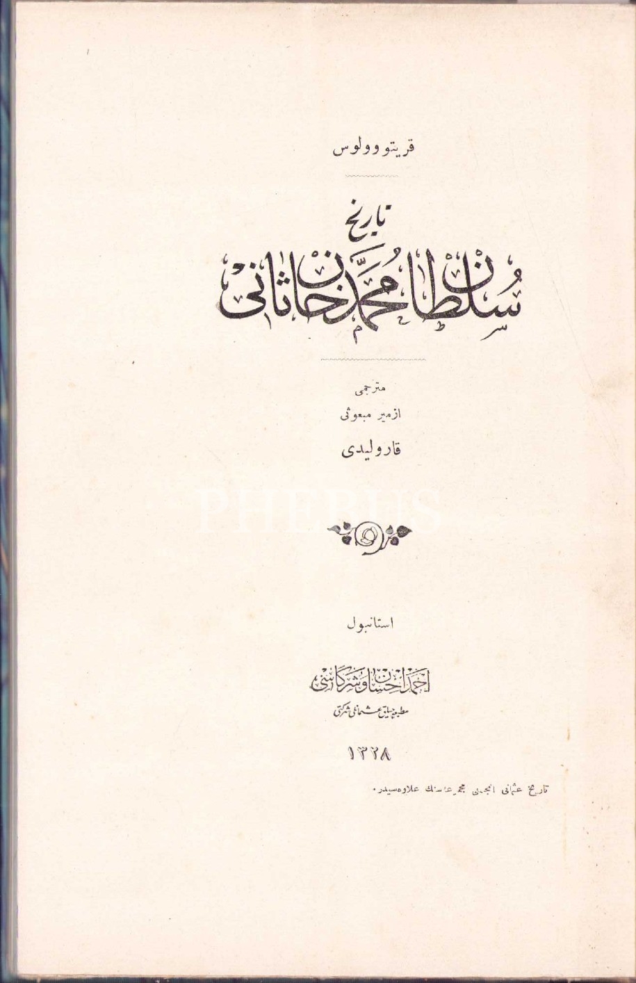 TÂRÎH-İ SULTÂN MEHMED HÂN-I SÂNÎ, Kritovulos, çev. Karolidi, Ahmed İhsan ve Şürekası Matbaacılık Osmanlı Şirketi, İstanbul 1328, 200 s. [176-193 arası eksik], 17x25 cm