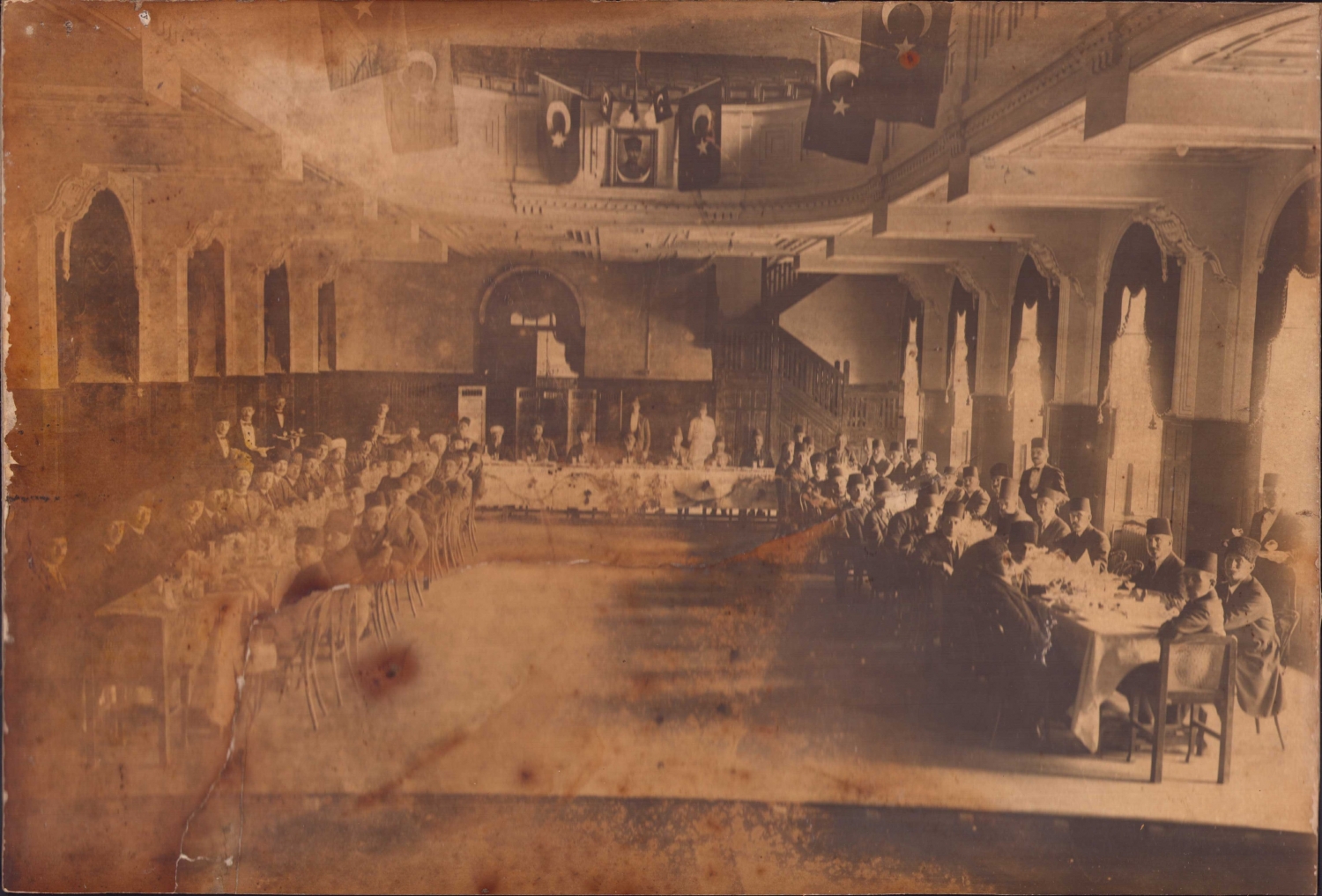 Kurtuluş savaşı komutanlarından Refet Bele ve ileri gelenler Galatasaray Lisesinde yemekte, büyük boy fotoğraf, haliyle, 25x37 cm