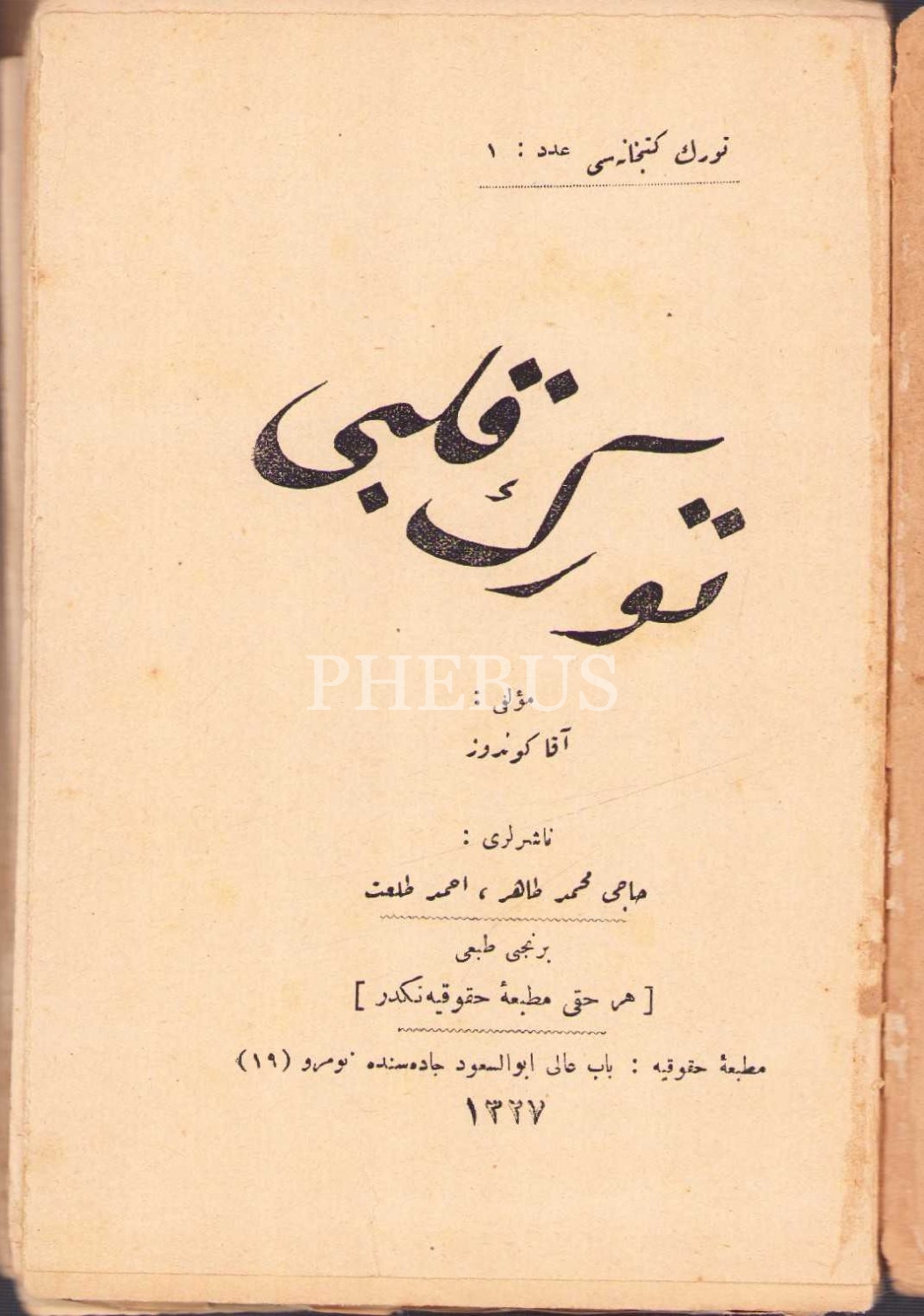 TÜRK KALBİ [1. Baskı], Aka Gündüz, Hukukiye Matbaası, 1327, 183 s., 13x19 cm, kapağı ve formaları ayrık haliyle