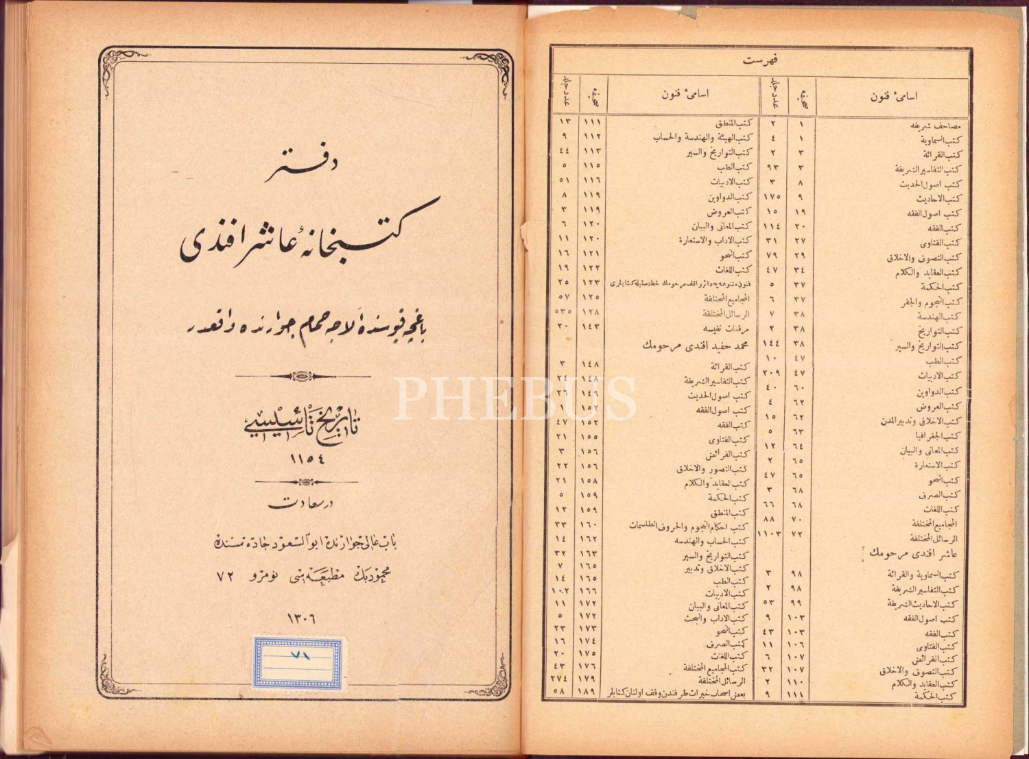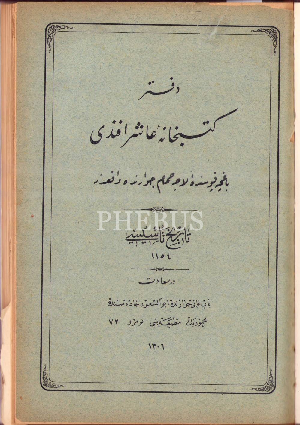 DEFTER-İ KÜTÜBHÂNE-İ ÂŞİR EFENDİ, Mahmud Bey Matbaası, Dersaadet 1306, 193 s., 19x28 cm