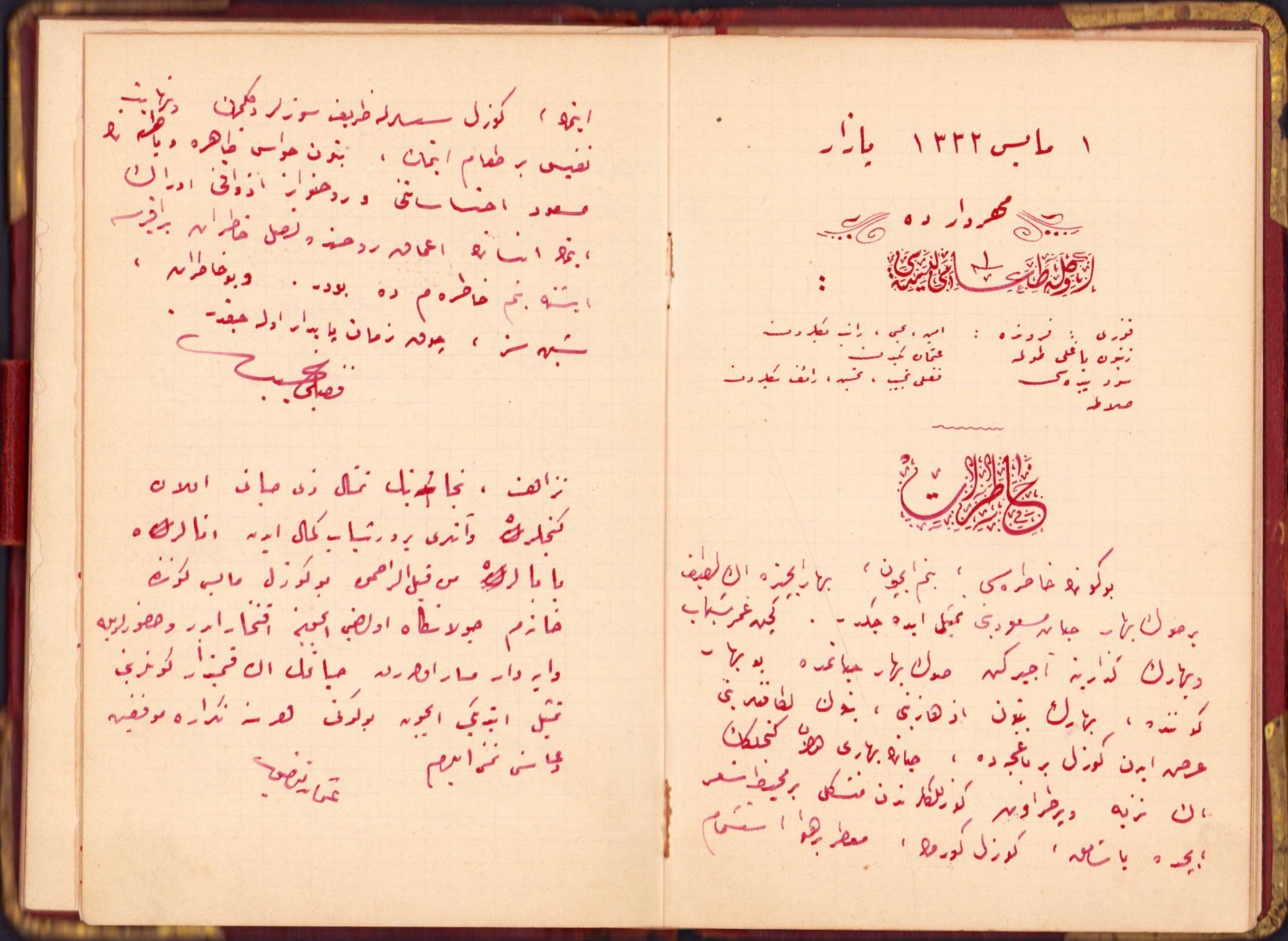 1 Mayıs 1332 tarihine ait öğle yemeği listesi yazmakta: Kuzu fırın, zeytinyağlı dolma, süt pidesi, salata