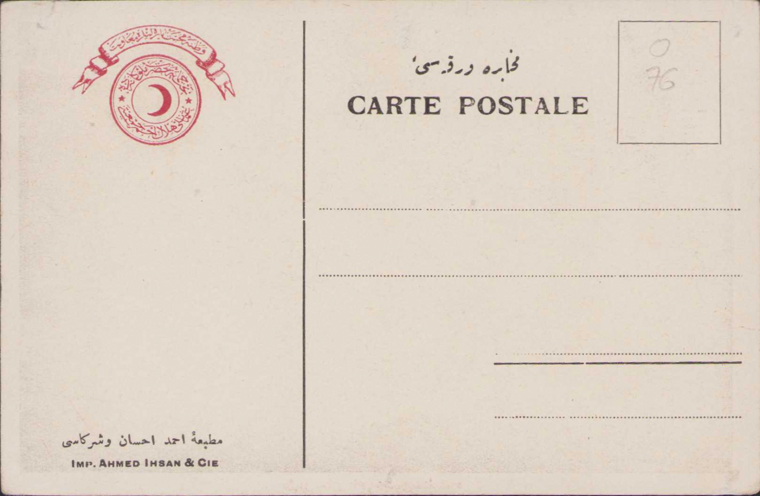Ön yüzünde osmanlıca, Osmanlı Hilal-i Ahmer Cemiyeti menfaatinedir yazıyor. Matbaa-i Ahmet İhsan ve Şürekası.