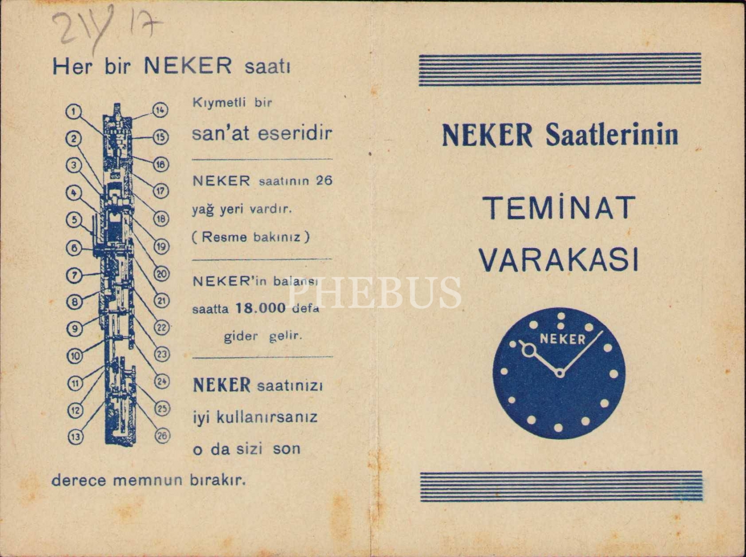 Neker saat garanti belgesi, 10x14 cm, alt kenarı hafif yırtık haliyle