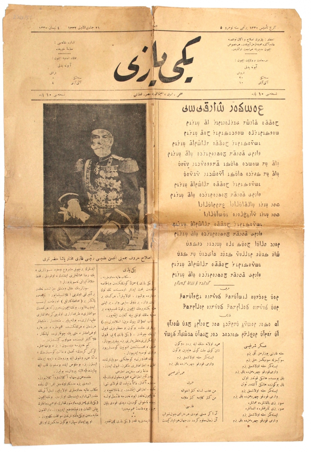 Osmanlıca ve Enveri harfli 2 dilde, Osmanlı Yeni Yazı Gazetesi, 1330 tarihli, Matbaa-i Harbiye, resimli, manşet, "Islah-ı Huruf Cemiyeti Encümeni İlmiye Reisi Muhtar Paşa"
