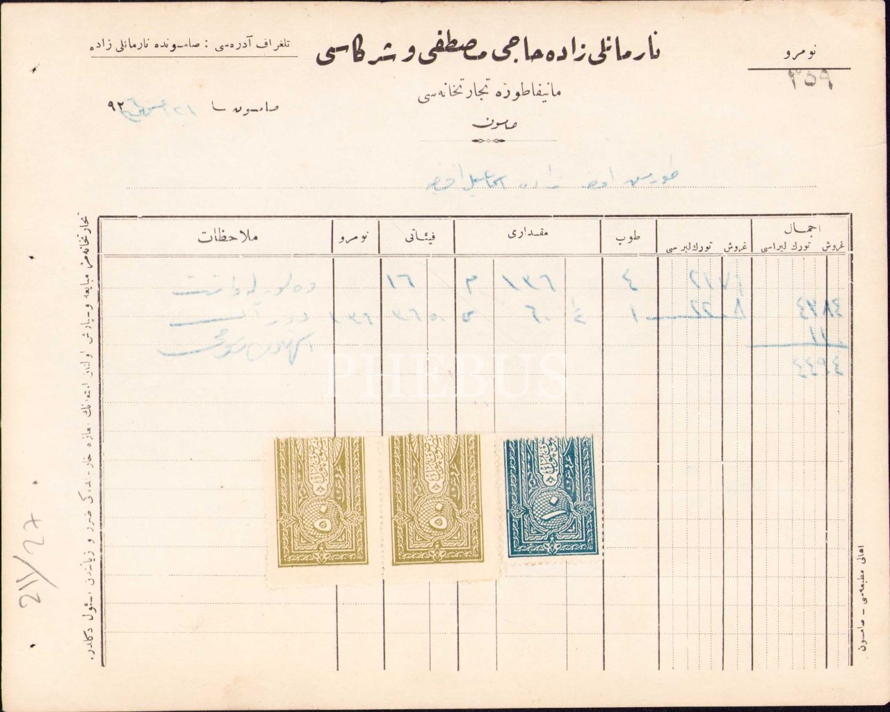 Narmanlızade Hacı Mustafa ve Şürekası Manifatura Ticarethanesi antetli fatura, Samsun 1926, 18x23 cm