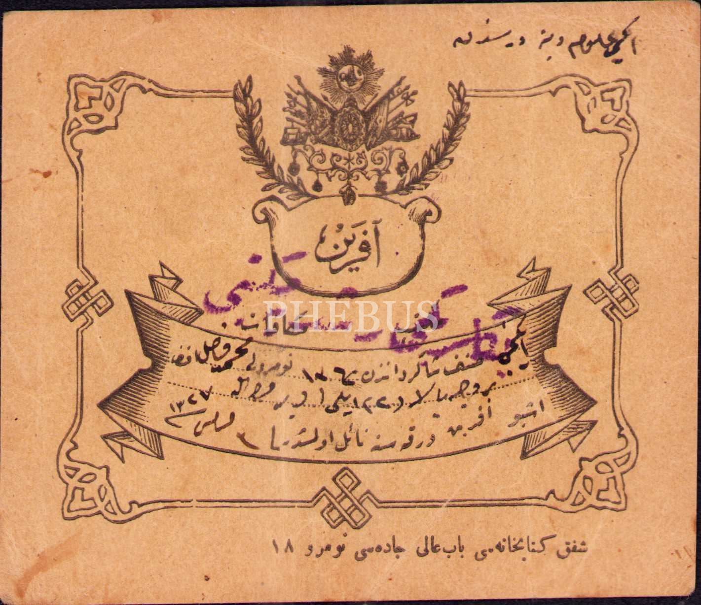 Eğitim tarihi: Beylerbeyi Rüşdiye Mektebi´nden 1327 tarihli aferin kâğıdı, 10x12 cm