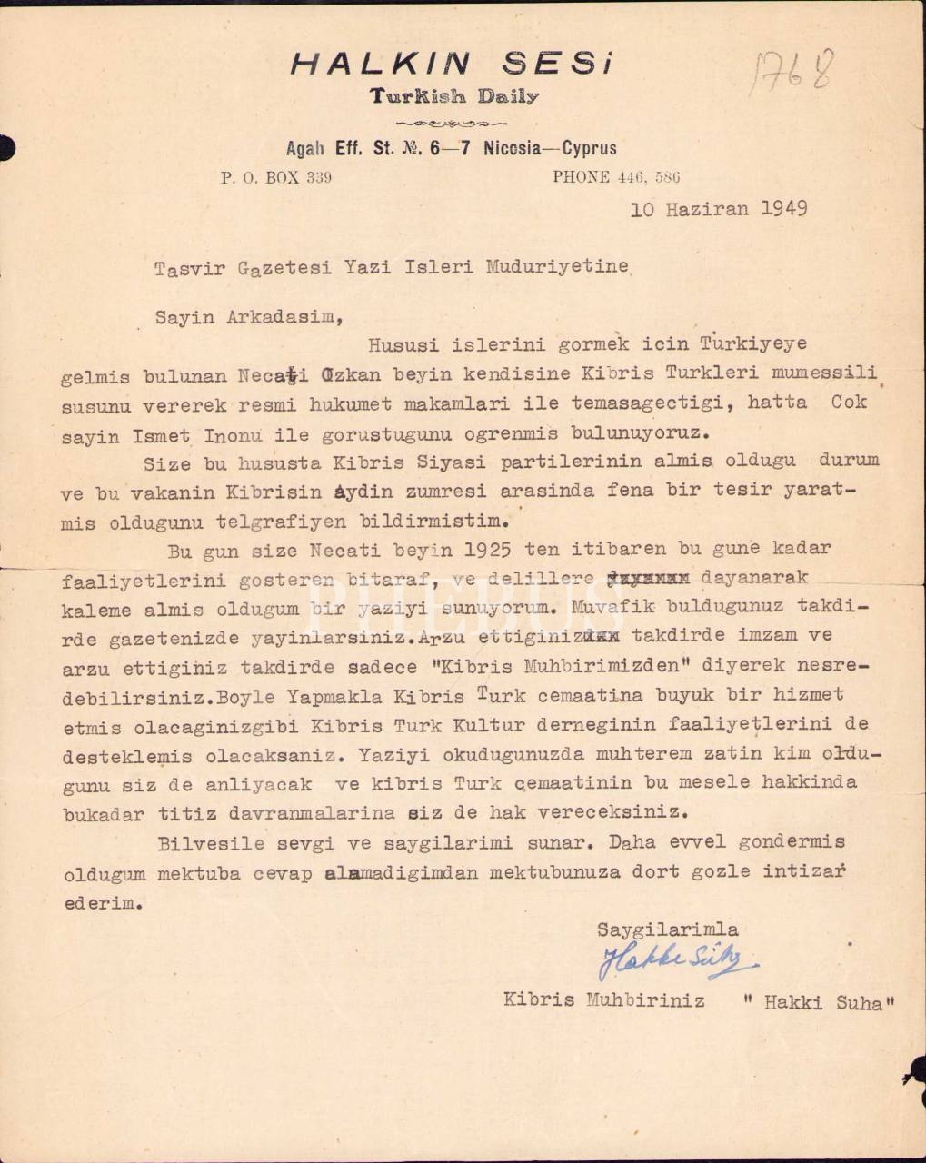 Halkın Sesi antetli kâğıtta kaleme alınan mektup, "Sayın Arkadaşım, Hususi islerini gormek icin Turkiyeye gelmis bulunan Necati Ozkan beyin kendisine Kibris Turkleri mumessili susunu vererek resmi hukumet makamlari ile temasagectigi, hatta Cok sayin Ismet Inonu ile gorustugunu ogrenmis bulunuyoruz." ifadesi ile başlamaktadır.