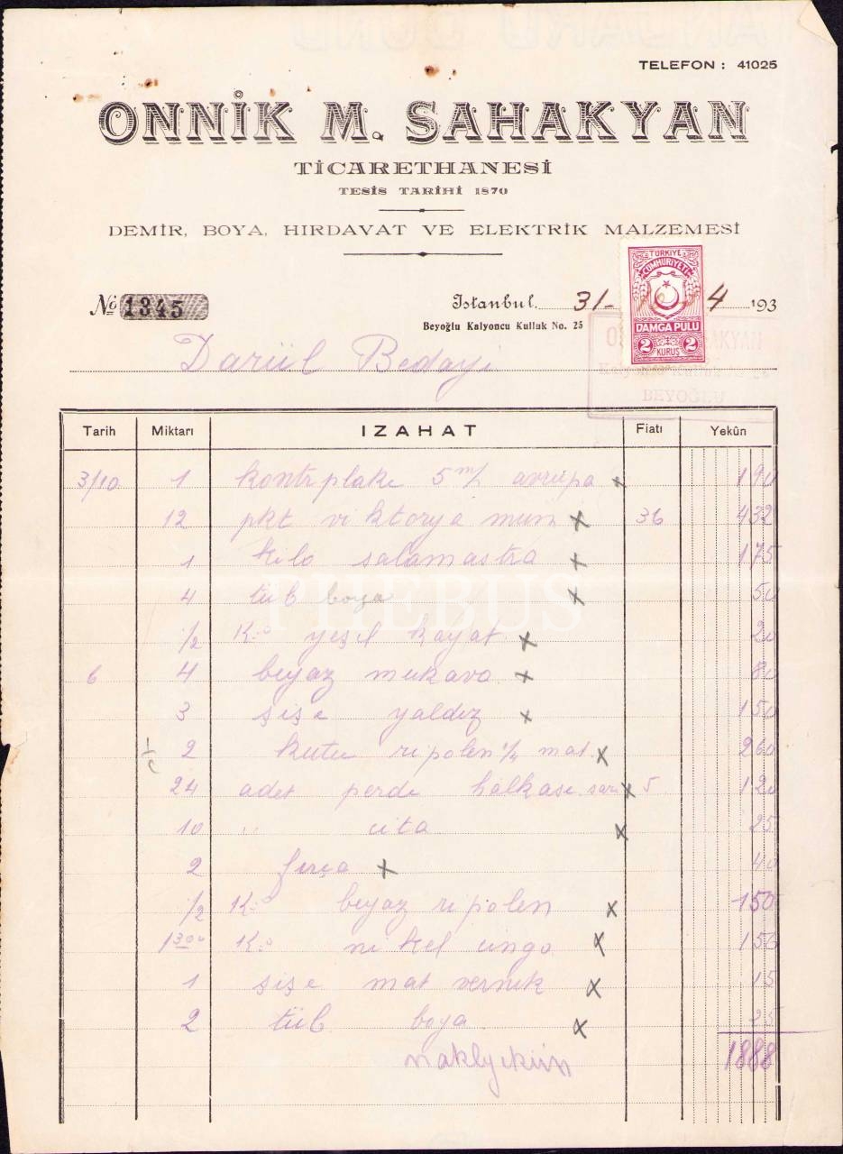 Hırdavat ve elektrik ticarethanesi Onnik M. Sahakyan´dan Darülbedayi adına kesilmiş 1934 tarihli fatura, 21x29 cm