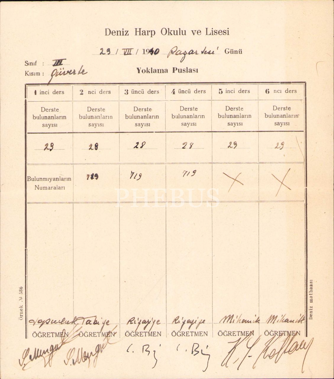 Deniz Harp Okulu ve Lisesi yoklama pusulası, 1940 tarihli, 20x23 cm