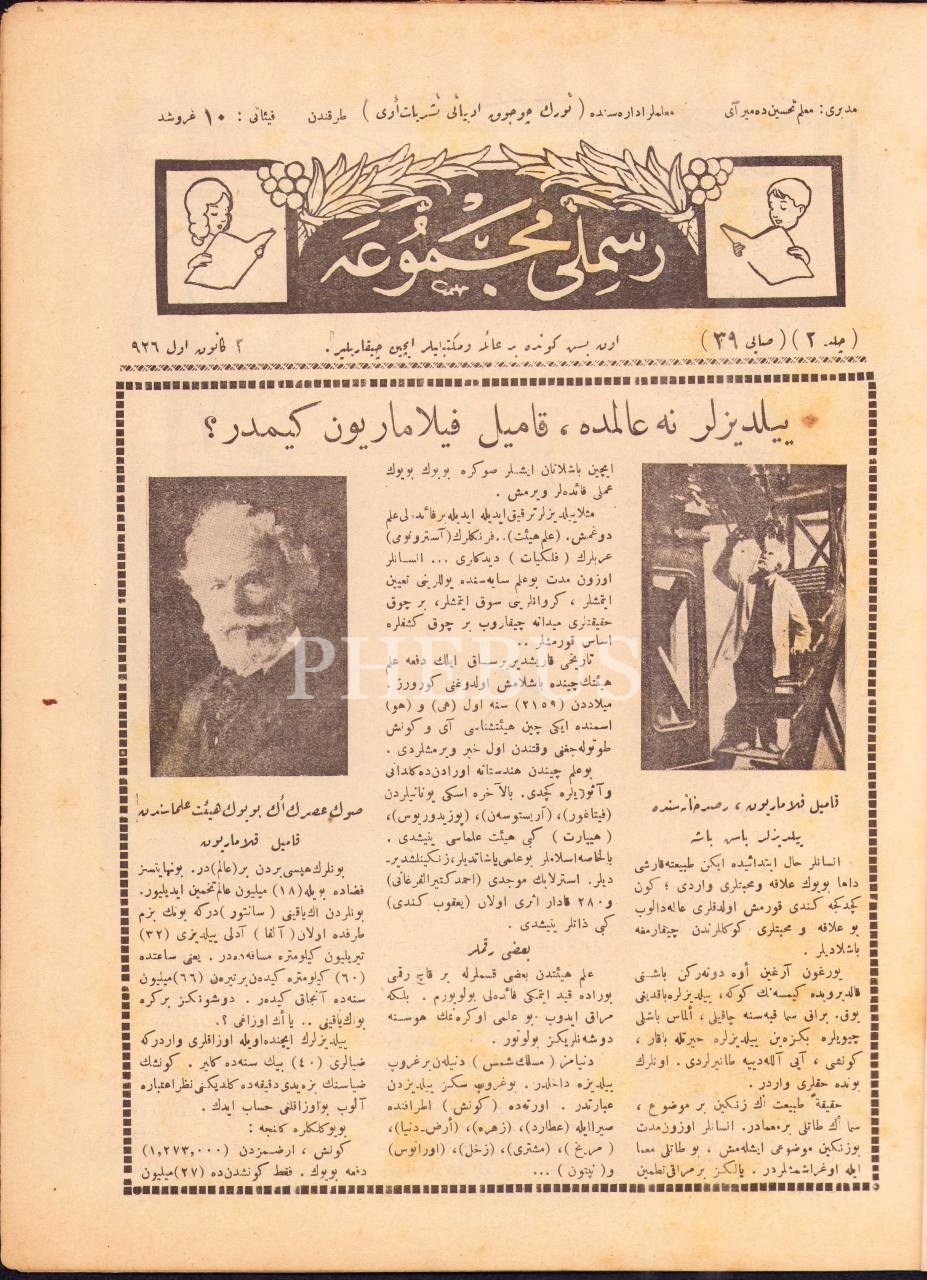 "Aile ve mektebliler" dergisi Resimli Mecmua´nın 39. sayısı, 2 Kanunuevvel 1926, "Yıldızlar ne âlemde, Camille Flammarion kimdir?" başlıklı kapak yazısıyla, 23x30 cm
