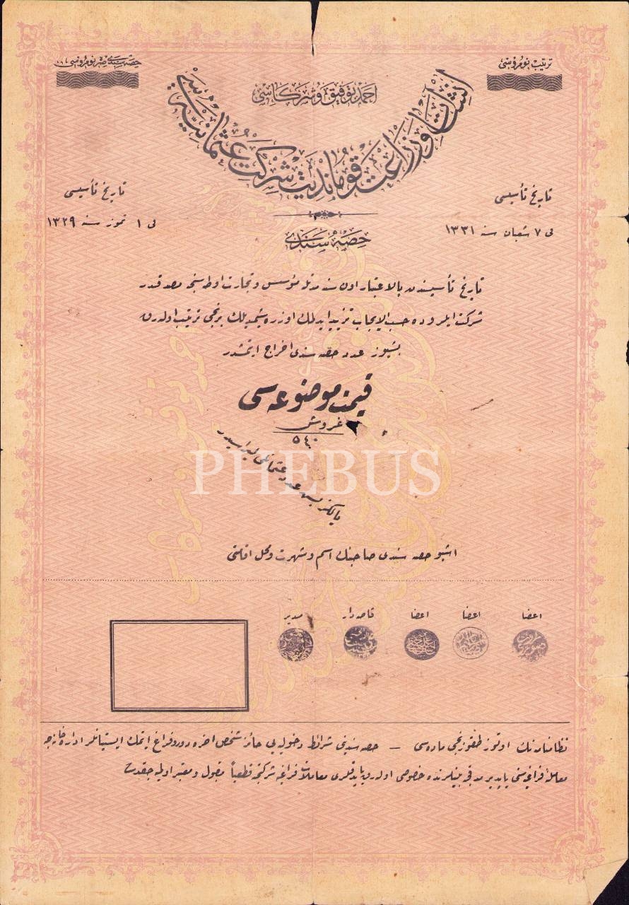 İnşaat ve Ziraat Komandit Şirket-i Osmaniyesi hisse senedi, 28x41 cm, kenarları yırtık haliyle