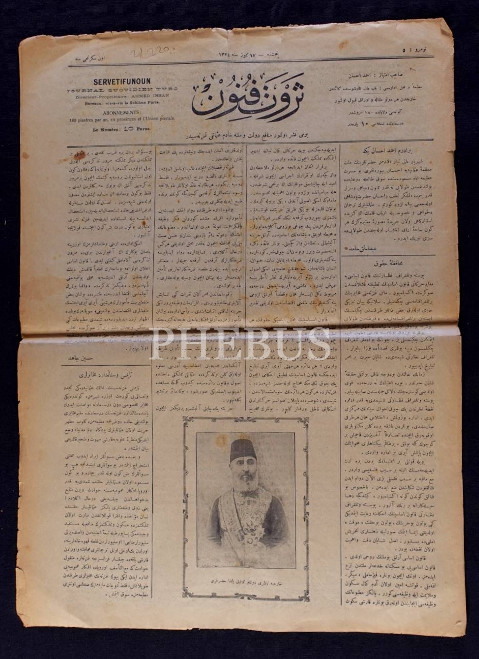 Servet-i Fünun gazetesinin 5. sayısı, 17 Temmuz 1324, Hariciye Nazırı Tevfik Paşa´ya ait kapak görseliyle, 34x48 cm