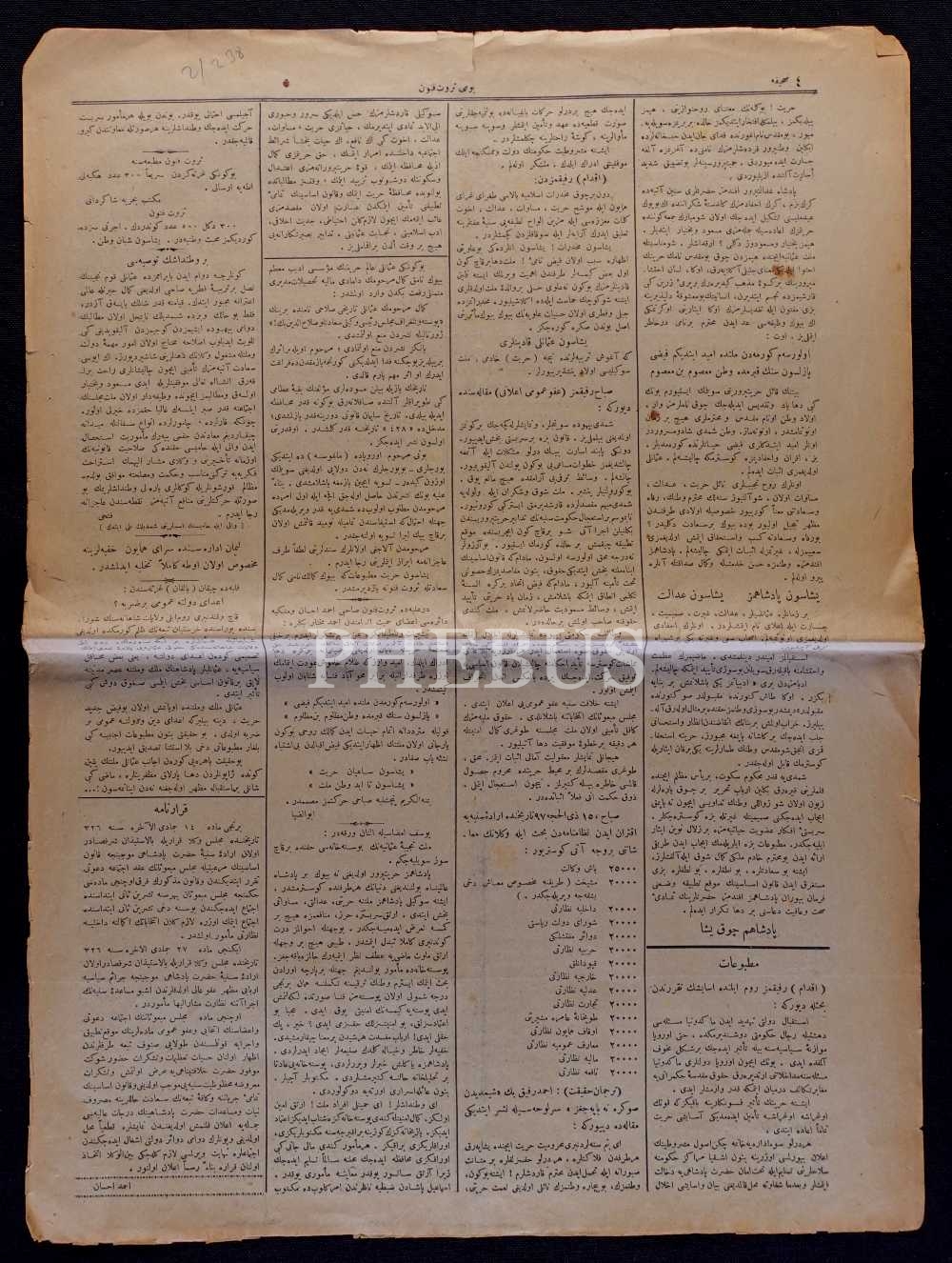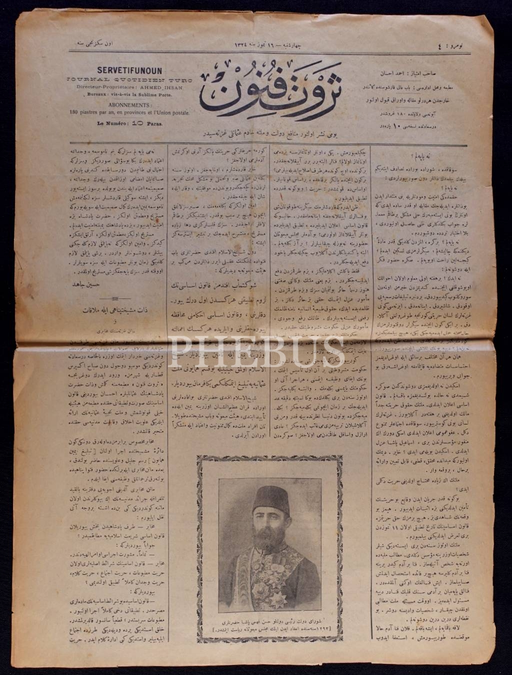 Servet-i Fünun gazetesinin 4. sayısı, 16 Temmuz 1324, Şura-yı Devlet Reisi Hasan Fehmi Paşa´ya ait kapak görseliyle, 35x46 cm