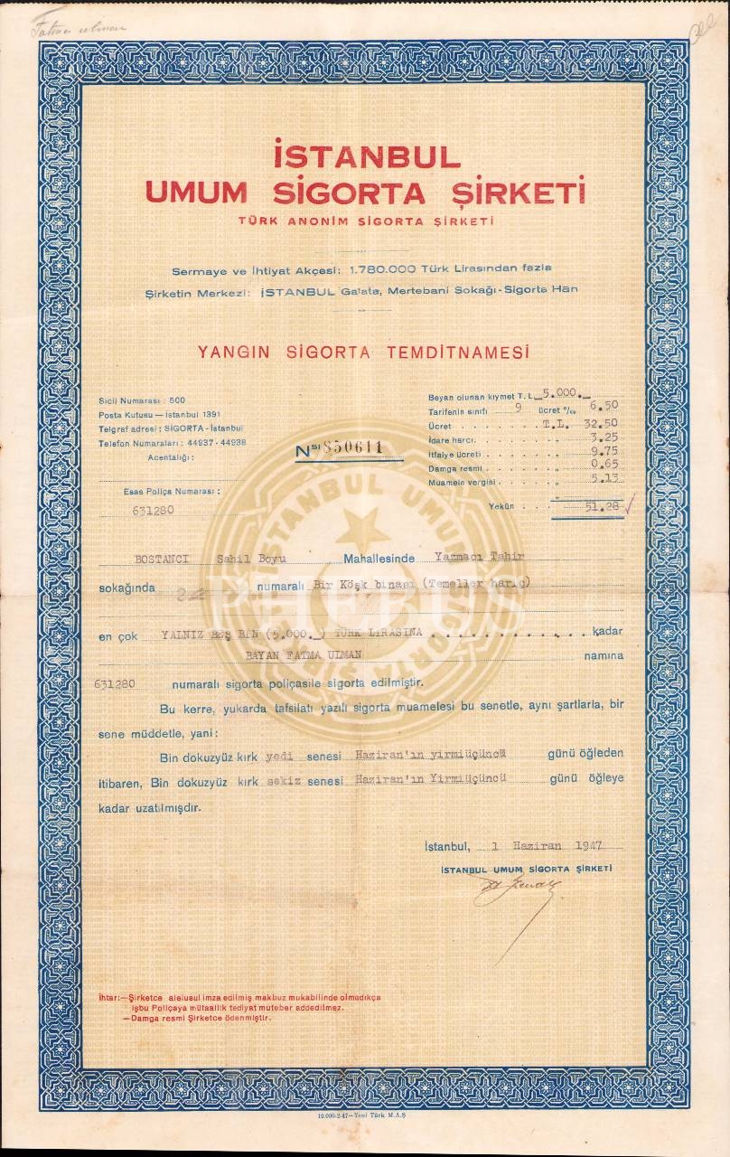İstanbul Umum Sigorta Şirketi yangın sigortası süre uzatma belgesi, 1947 tarihli, 27x43 cm