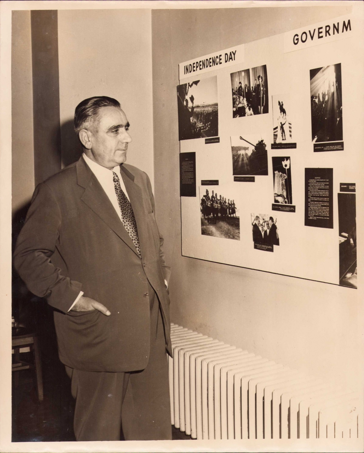 T.B.M.M. Genel Sekreteri Refet Sezen Amerika gezisinde konsolosluk binasında 29 Ekim Cumhuriyet bayramı için hazırlanan pano önünde, 5 Ekim 1953