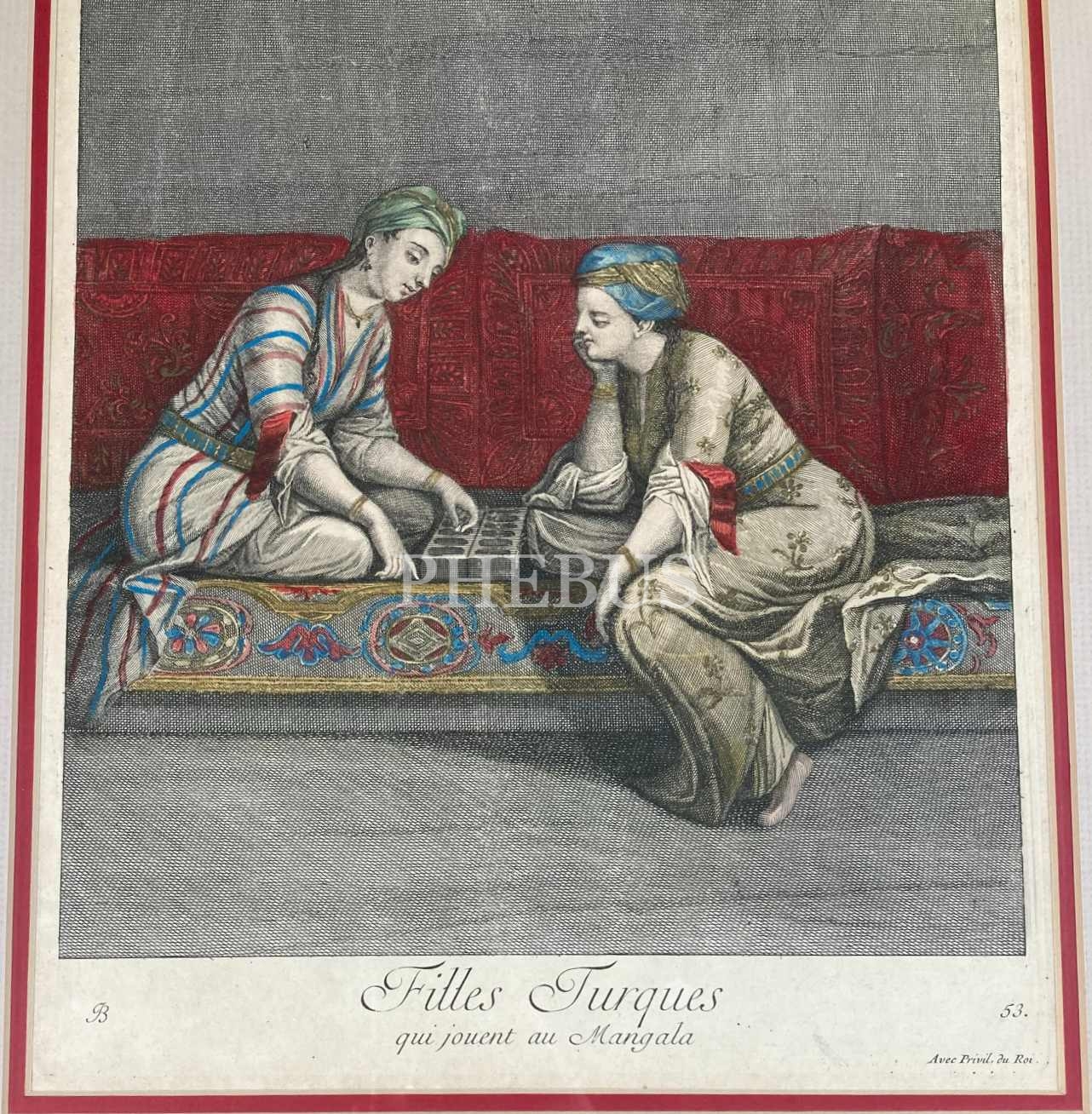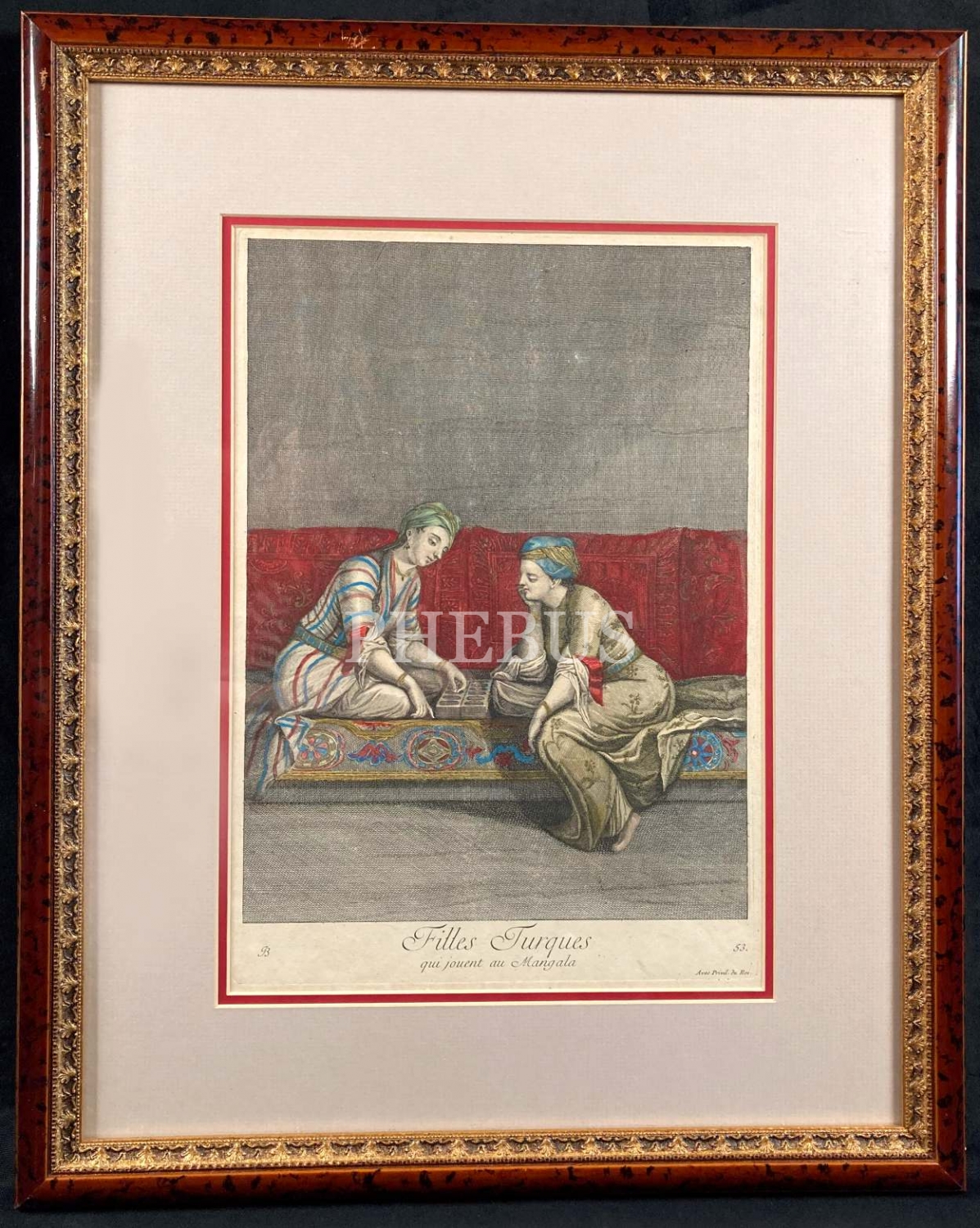“Mangala oynayan Türk kızları” özel yapılan kitaptan çıkma, döneminde elle renklendirilmiş gravür, 18. yy. 25x36 cm