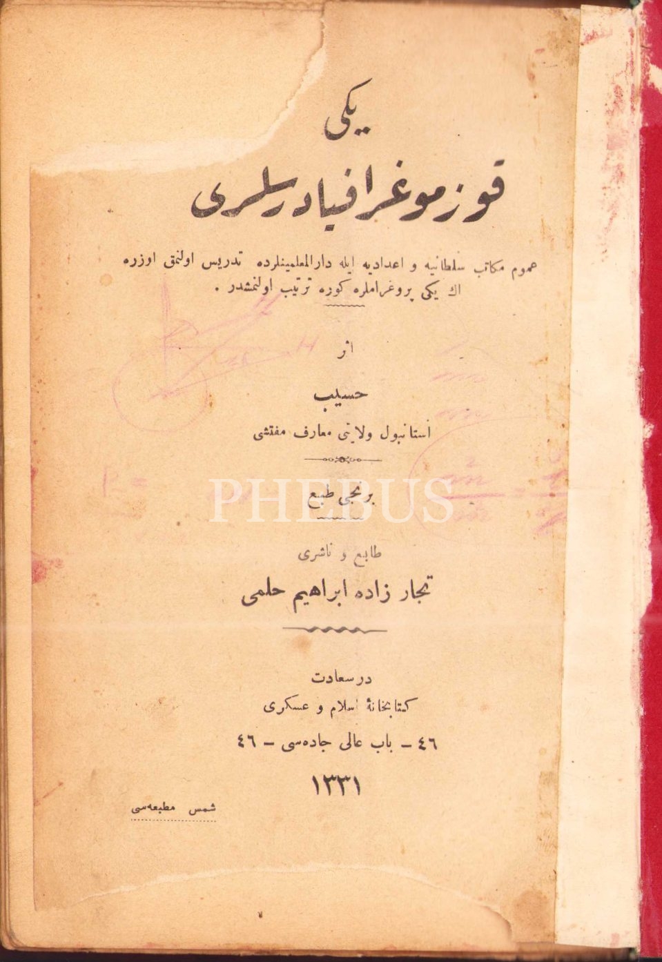 Yeni KOZMOGRAFYA DERSLERİ [1. Baskı], Hasib, Şems Matbaası, Dersaadet 1331, 350 s., 14x21 cm, künye sayfası yırtık haliyle