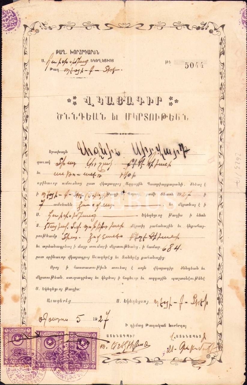 Vıgayakir Dznuntyan Yev Mıgırdutyab. Azniv-Sirvat Pehehian'ın (?) 1927 yılında Büyükdere Ermeni Apostolik Kilisesinde vaftiz edildiğine dair Doğum ve Vaftiz Belgesi.