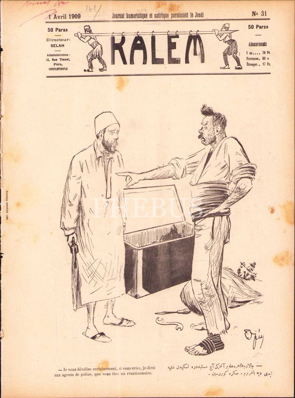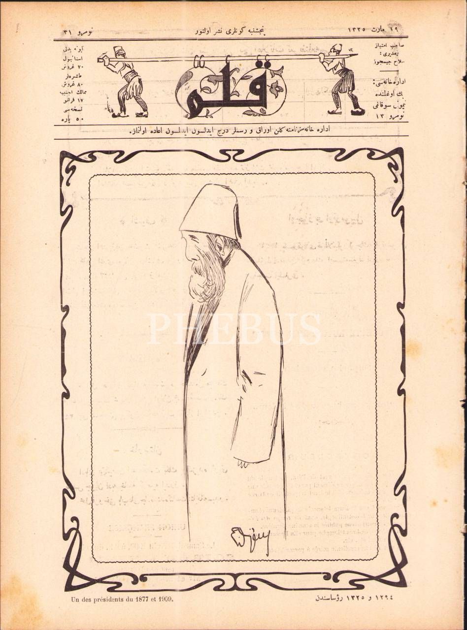 Osmanlıca-Fransızca Kalem dergisinin 31. sayısı, 19 Mart 1325, "1877 ve 1909 Rüesasından" başlıklı kapak görseliyle, 22x29 cm