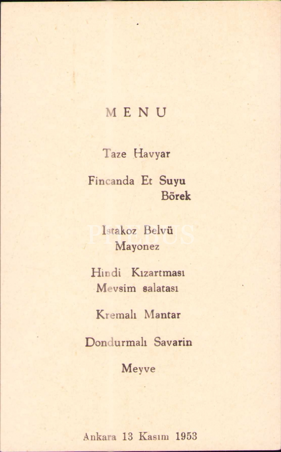 1953 tarihli yemek menüsü kartı, 9x15 cm