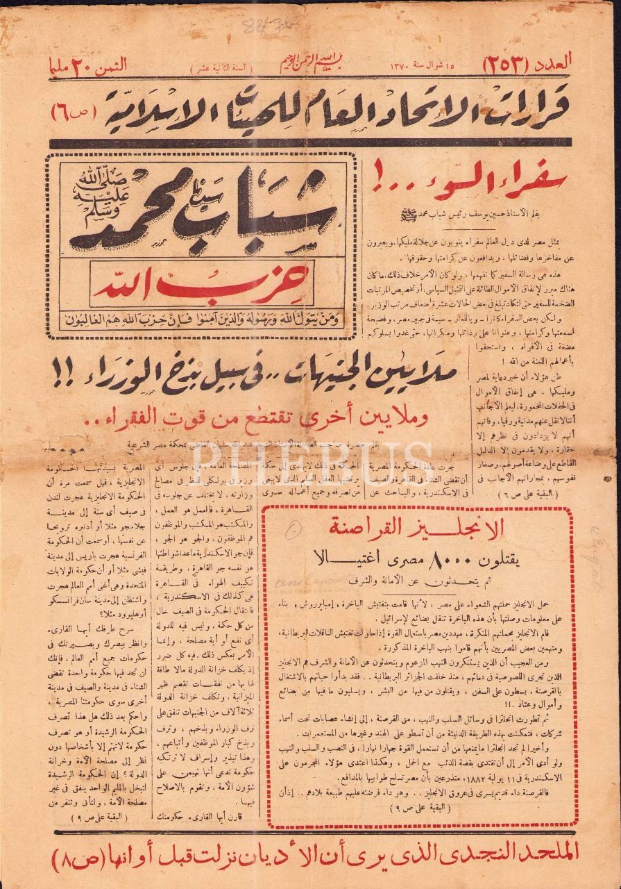 Arapça Şebabu Seyyidina Muhammed [Efendimiz Muhammed´in Gençleri] gazetesinin 15 Şevval 1370 tarihli sayısı, 29x41 cm, sayfaları açılmamış haliyle