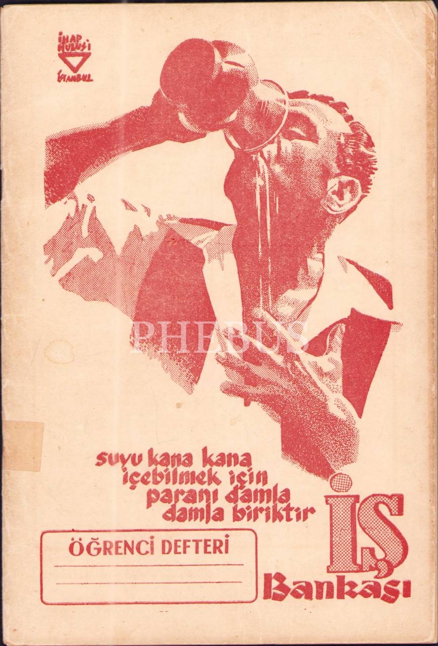 Eğitim tarihi: İhap Hulusi imzalı kapağıyla İş Bankası reklamlı boş öğrenci defteri, 16x24 cm