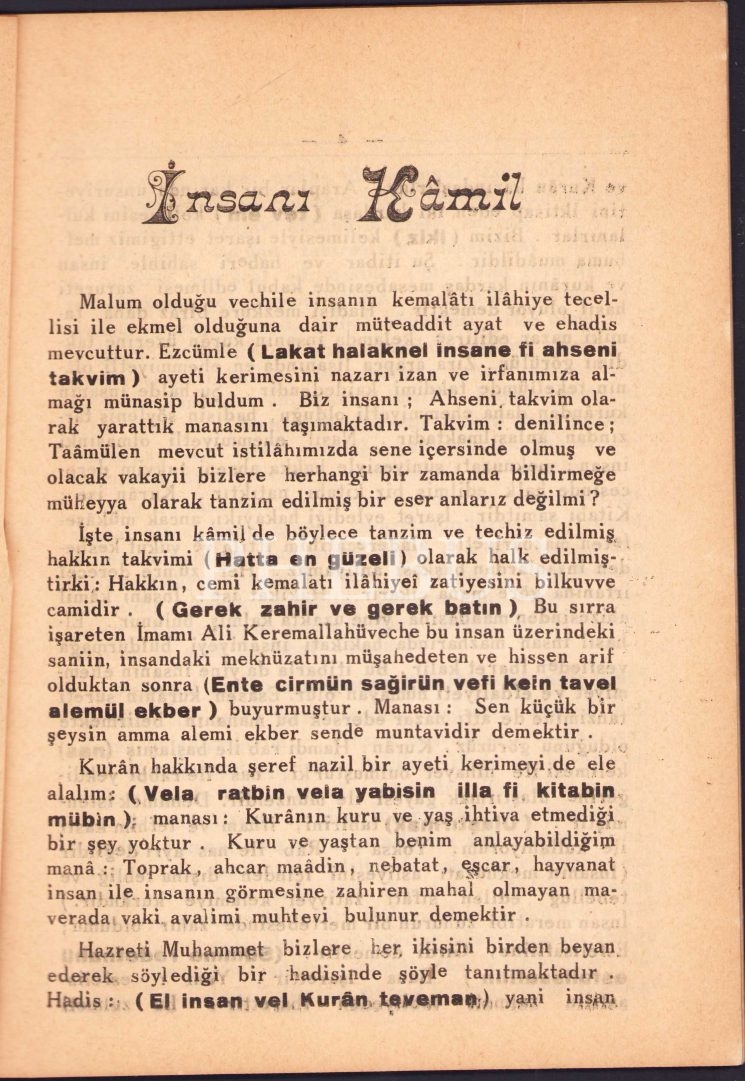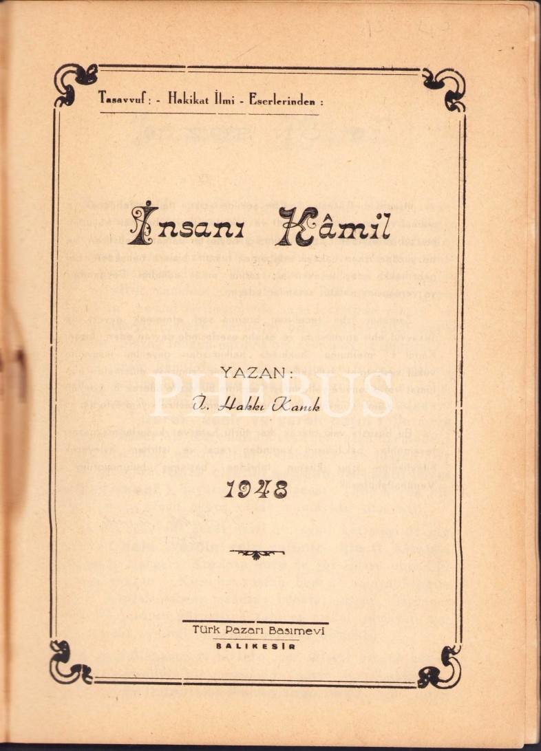 İNSANI KÂMİL, İ. Hakkı Kanık, Türk Pazarı Basımevi, Balıkesir 1948, 40 s., 16x23 cm