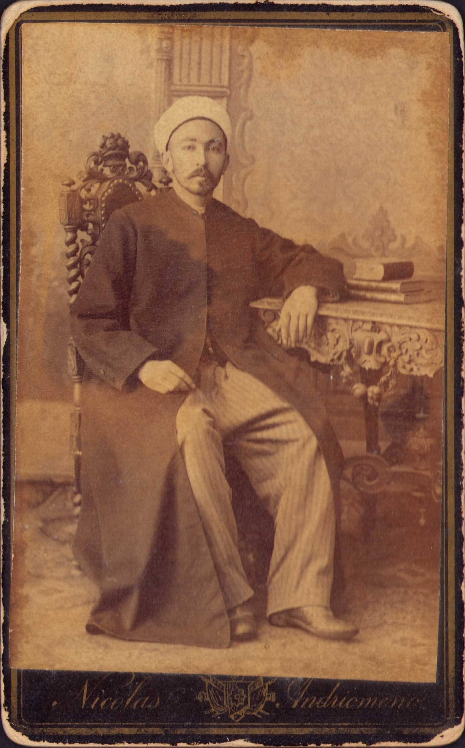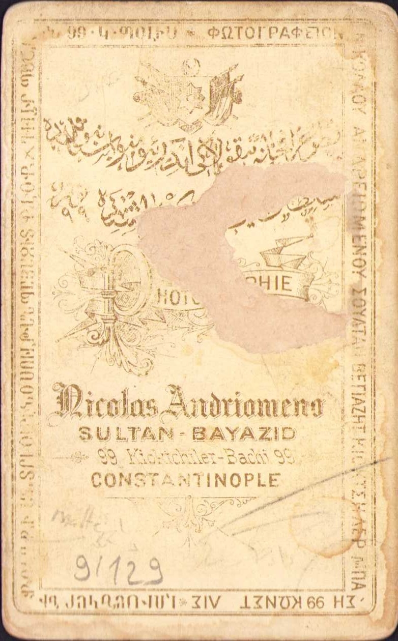Kabin foto sarıklı cübbeli adam, Nicolas Andriomenos Fotoğrafhanesi, Constantinople, üç dilde yazılı