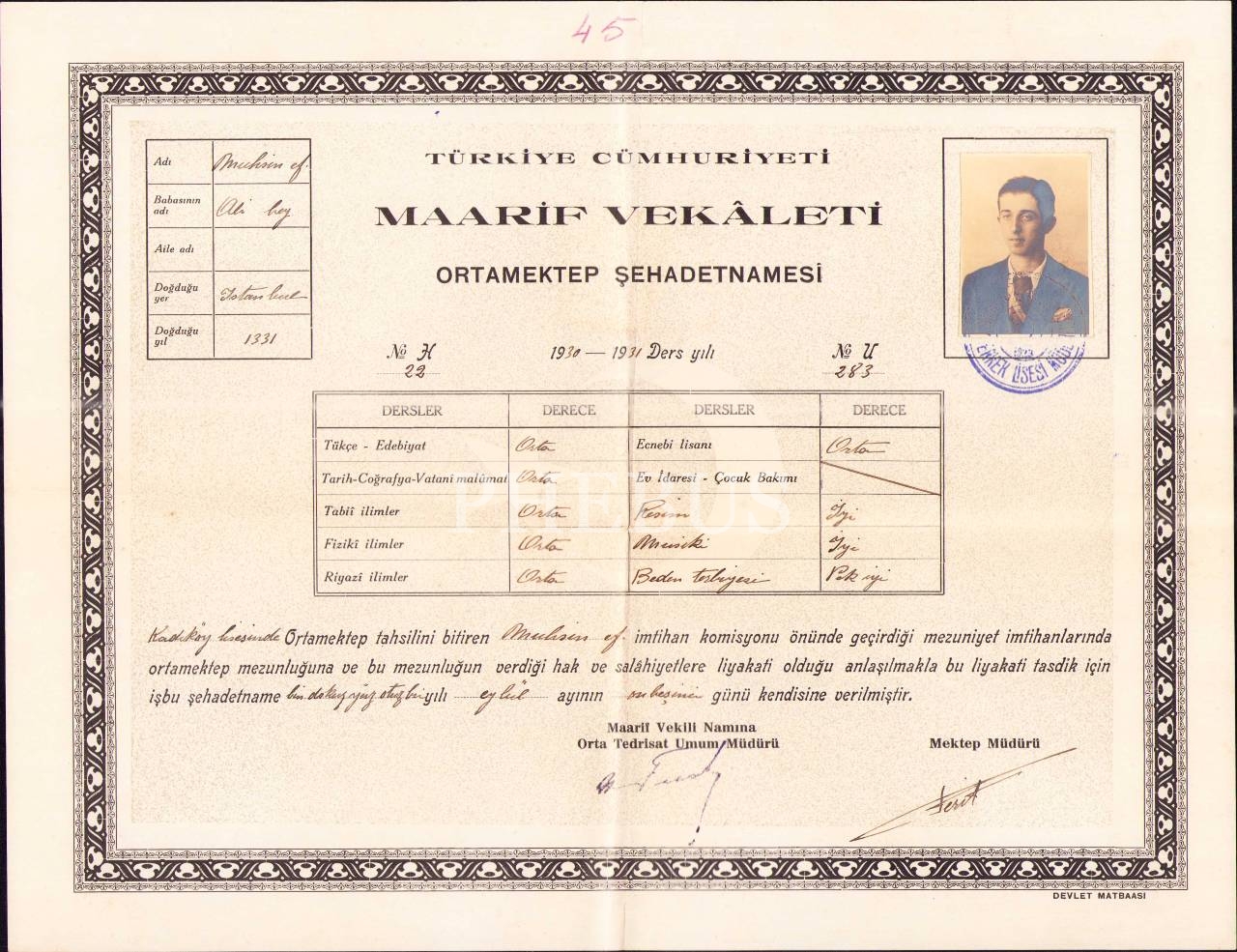 Eğitim tarihi: Kadıköy Lisesi´nden 1931 tarihli ve fotoğraflı ortaokul diploması,27x35 cm