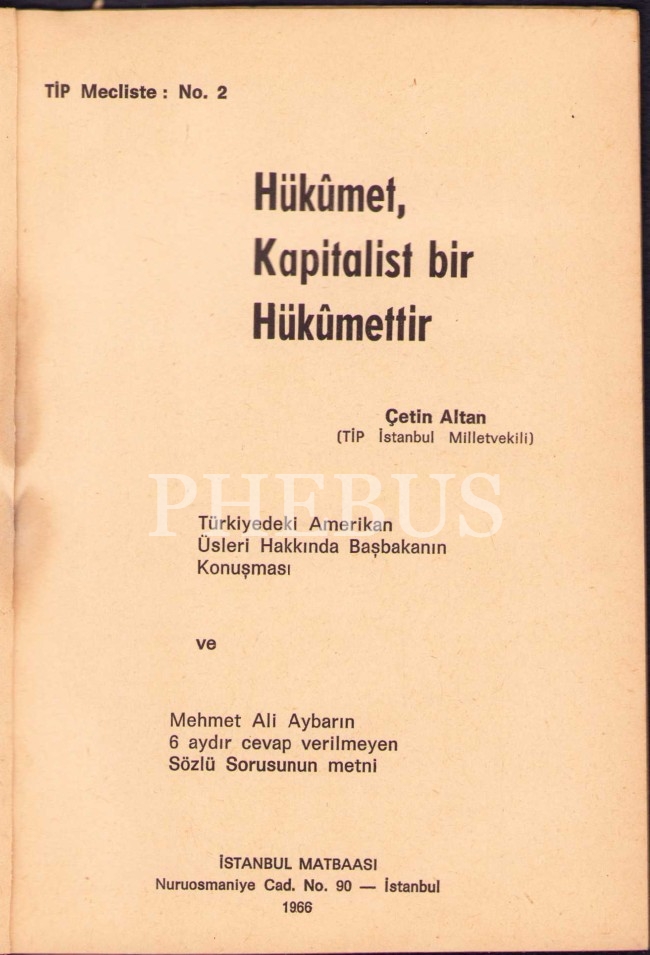 Siyaset tarihi: TİP Mecliste serisinden "Hükûmet, Kapitalist bir Hükûmettir", Çetin Altan, İstanbul Matbaası, İstanbul 1966, 39 s., 12x16 cm