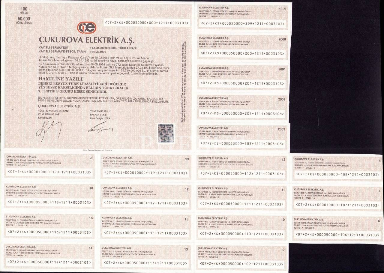Çukurova Elektrik A.Ş.´ye ait hisse senedi, 30x42 cm