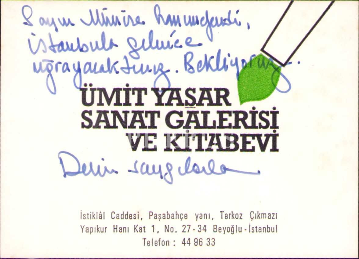 Ümit Yaşar Sanat Galerisi ve Kitabevi kartı üzerine not, 7x10 cm