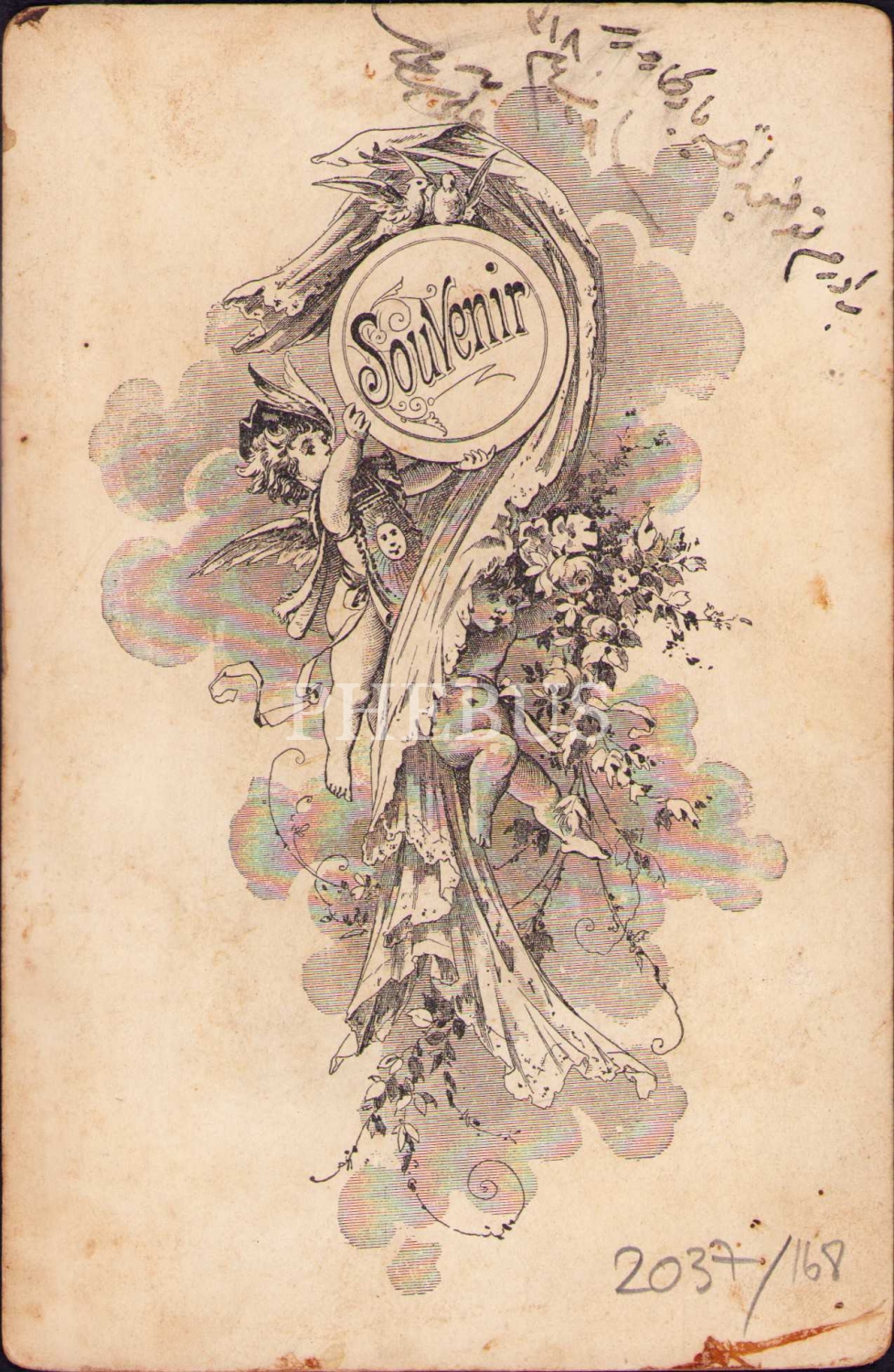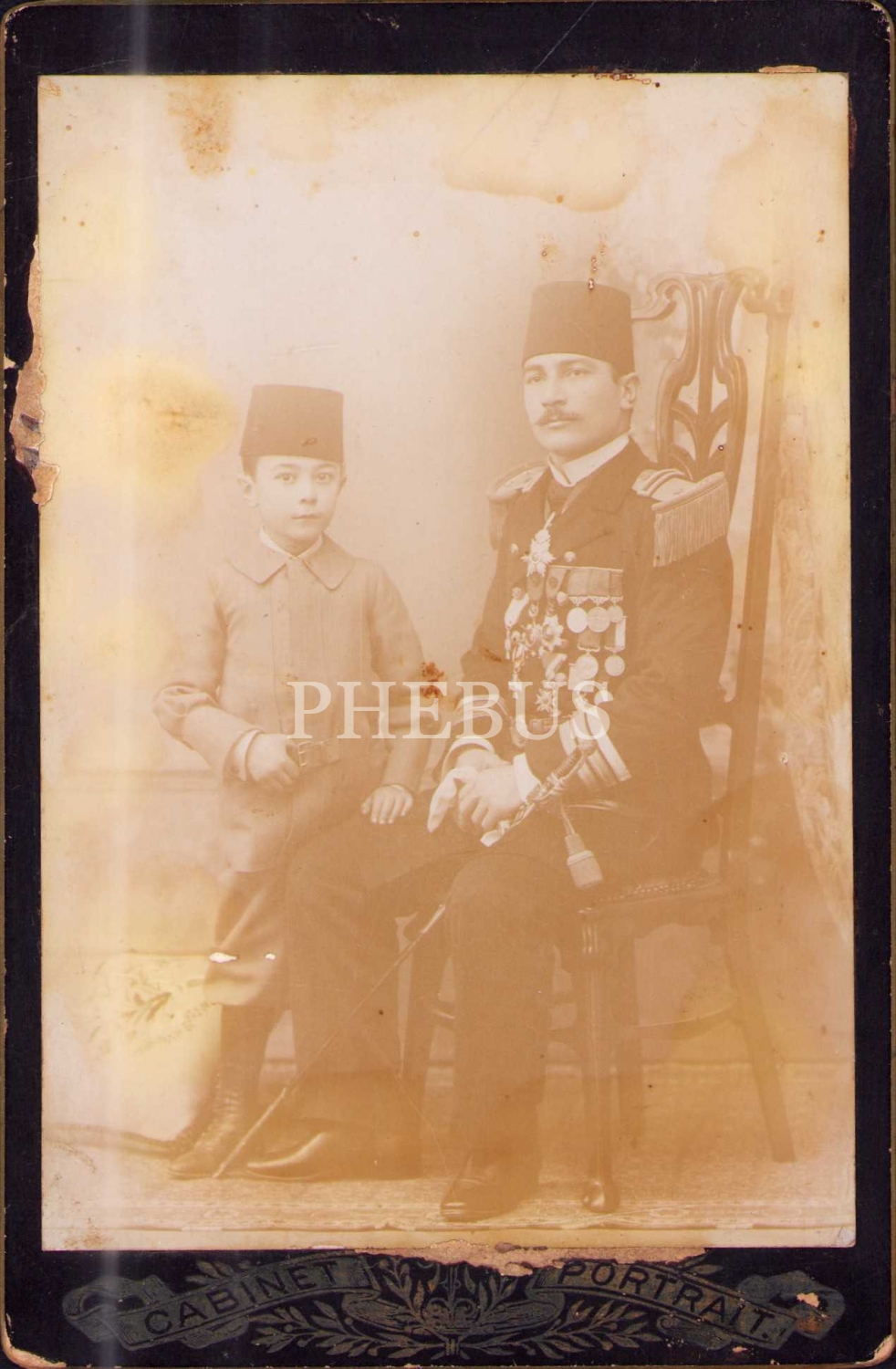 Madalyalı Osmanlı paşası ile fesli çocuğun kabin fotoğrafı, 1318 tarihli ithaf yazısıyla, 11x17 cm