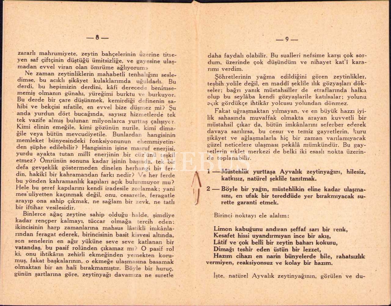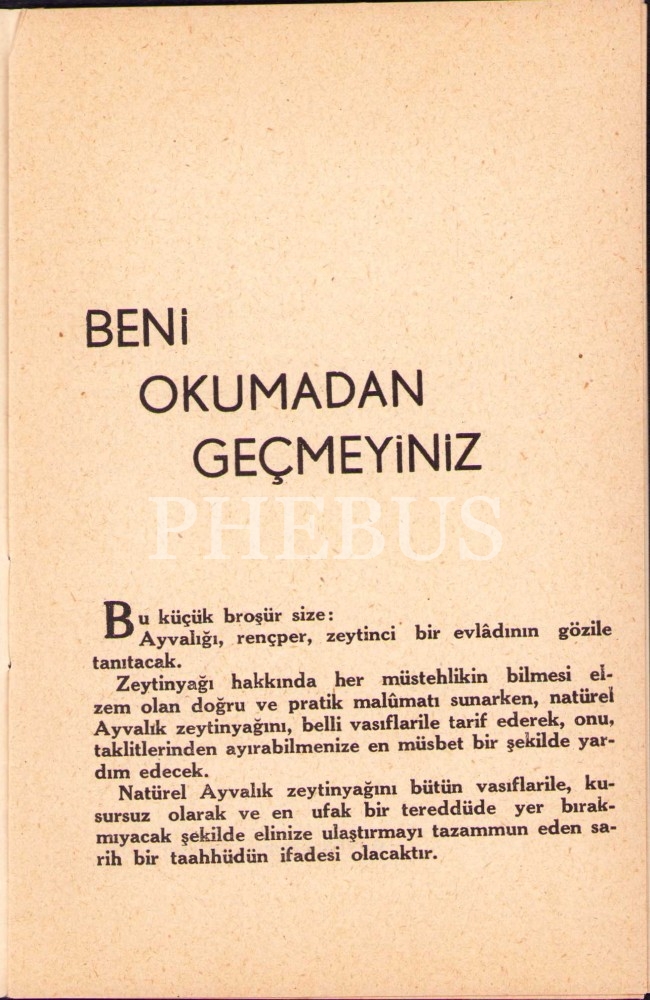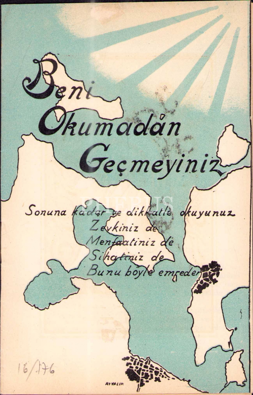 BENİ OKUMADAN GEÇMEYİNİZ (Ayvalık Zeytinyağı Kitapçığı), Güven Basımevi, İstanbul 1949, 15 s., 11x17 cm
