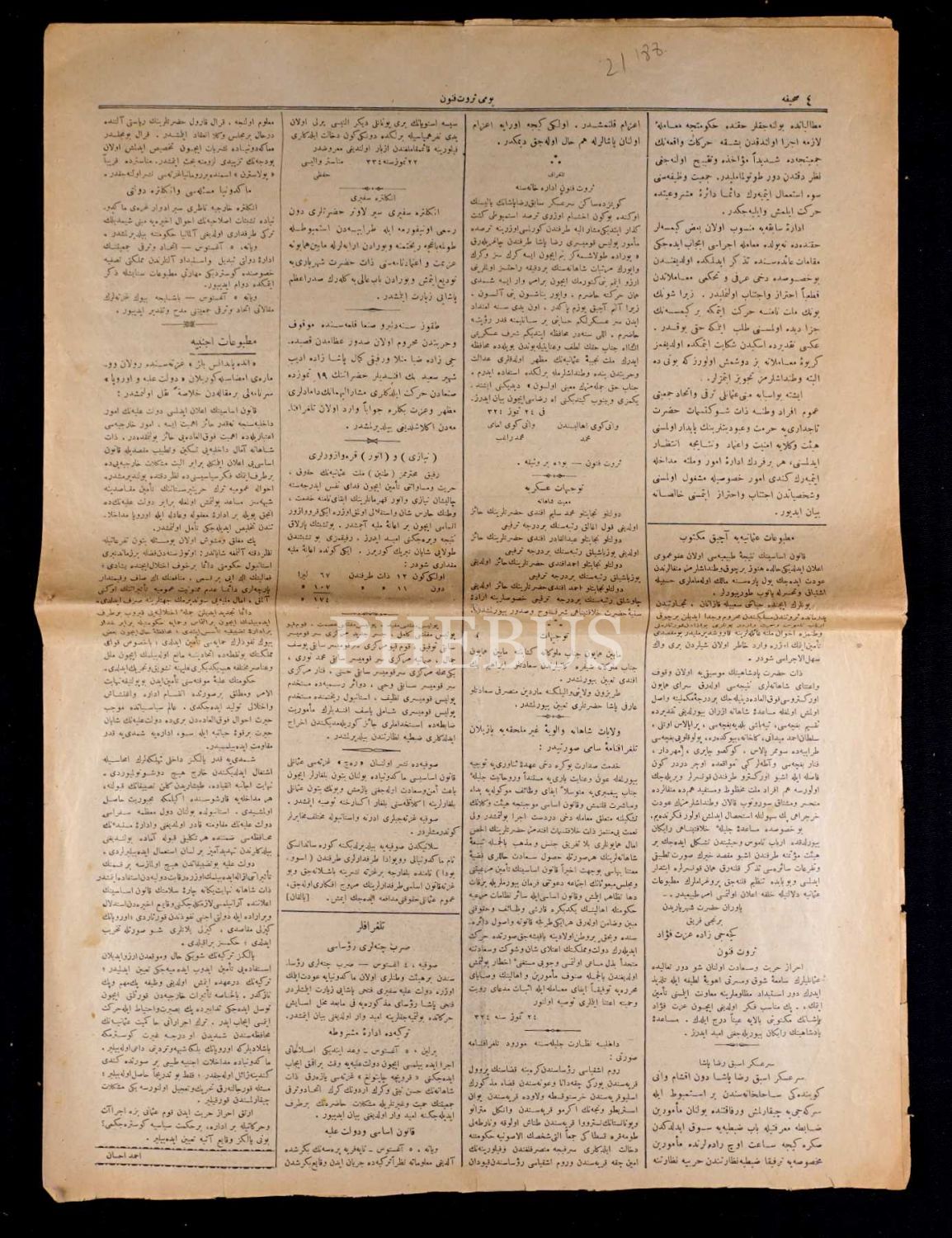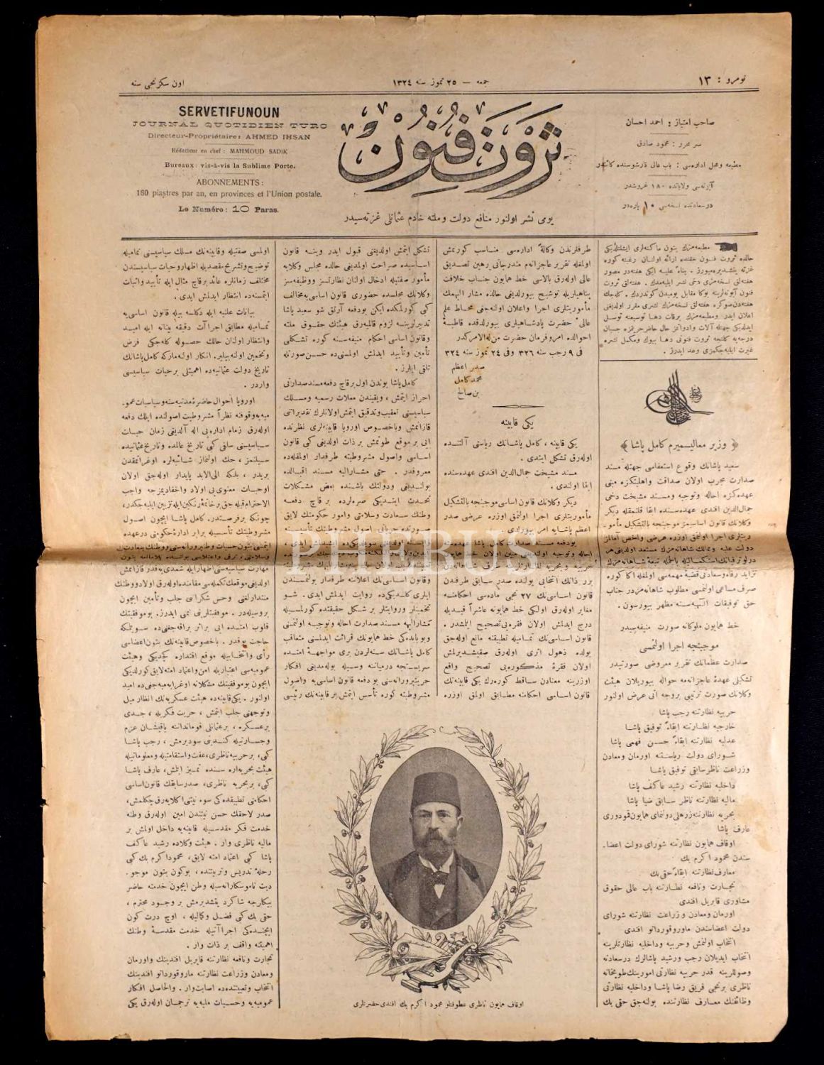 "Devlet ve millet menfaatlerine hizmet eden Osmanlı gazetesi" Servet-i Fünun´un 13. sayısı, Evkaf Nazırı Mahmud Ekrem Bey´e ait kapak görseliyle, 25 Temmuz 1324, 35x47 cm