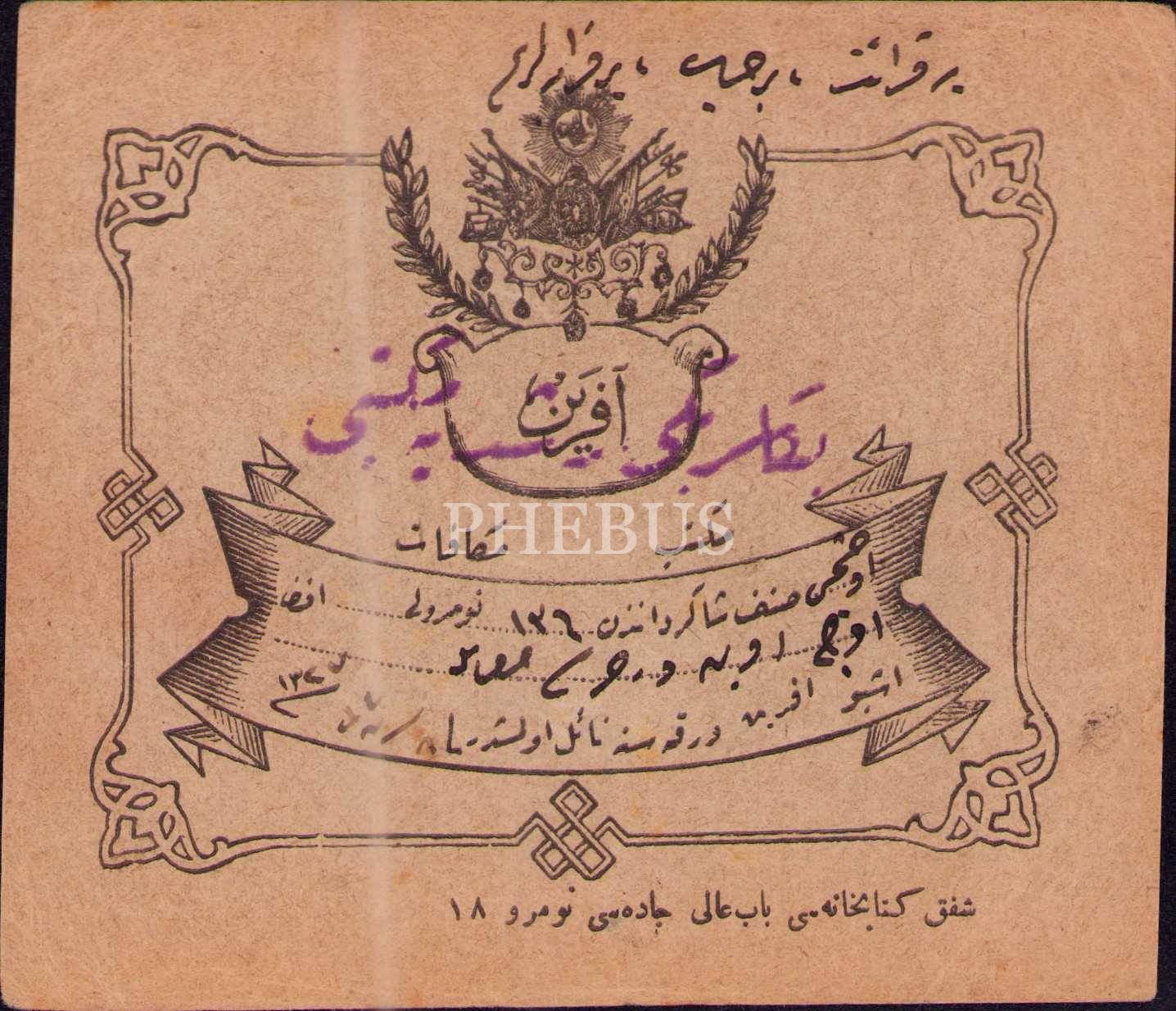 Eğitim tarihli: Beylerbeyi Rüşdiye Mektebi´nden 1327 tarihli aferin kâğıdı, 10x12 cm