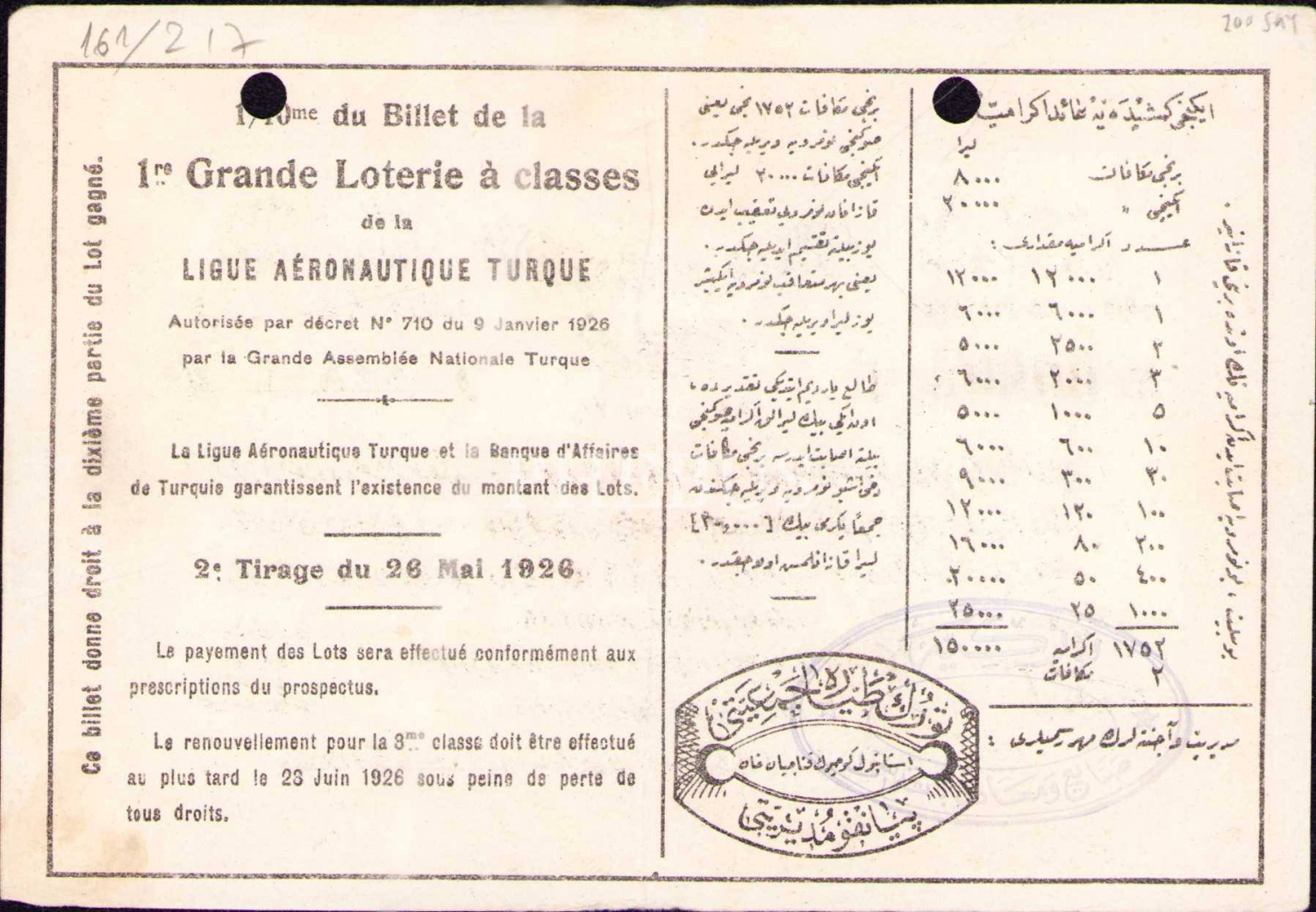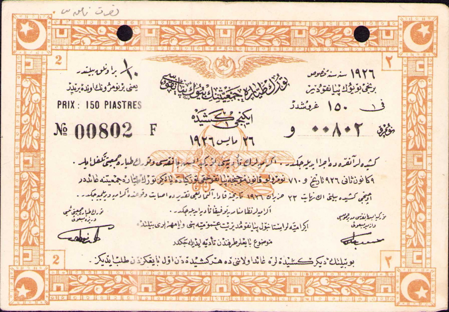 Havacılık tarihi: Türk Tayyare Cemiyeti piyangosu, 1926 tarihli, 10x15 cm