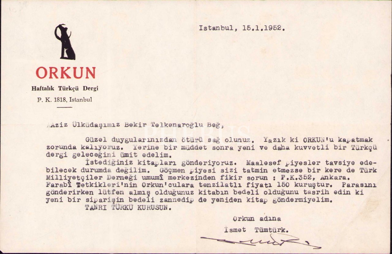 Türkçü Dergi Orkun´dan 1952 tarihli müşteri bilgilendirme mektubu, 15x22 cm