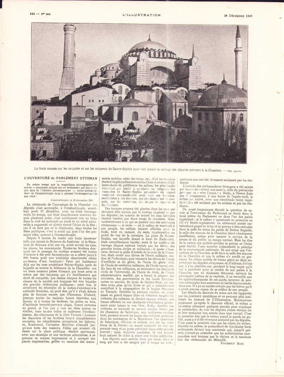 Fransızca L´Illustration dergisinin 26 Aralık 1908 tarihli sayısı, "İstanbul´da Tarihi Olay: 17 Aralık Temsilciler Meclisi Açılışı" başlıklı fotoğrafıyla, 29x38 cm