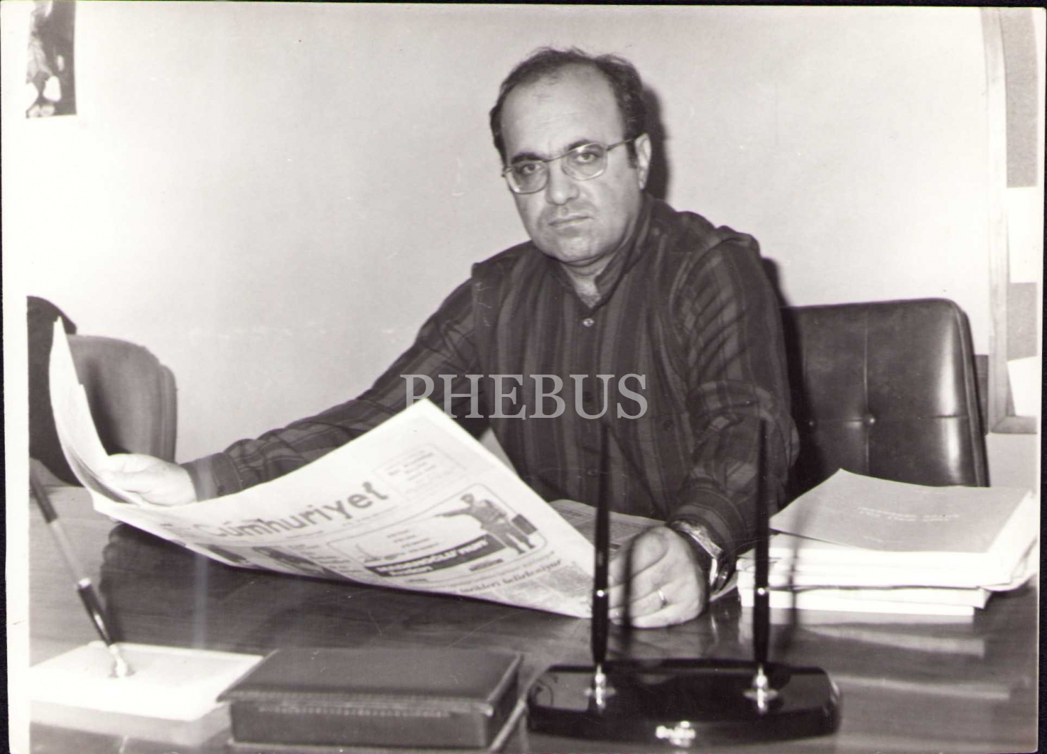 Basın tarihi: elinde Cumhuriyet gazetesi ile poz veren Uğur Mumcu, 12x16 cm