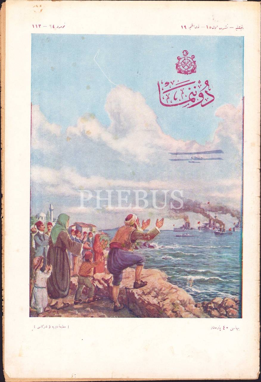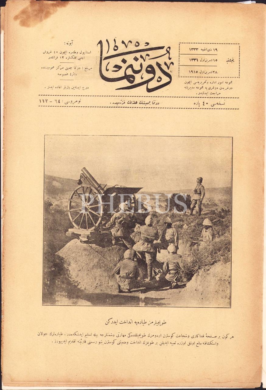 Donanma Cemiyeti´nin gazetesi Donanma´nın "Topçularımız tayyareye endaht [atış] ederken" başlıklı iç kapak görseliyle 28 Teşrinievvel 1915 tarihli sayısı, 25x37 cm
