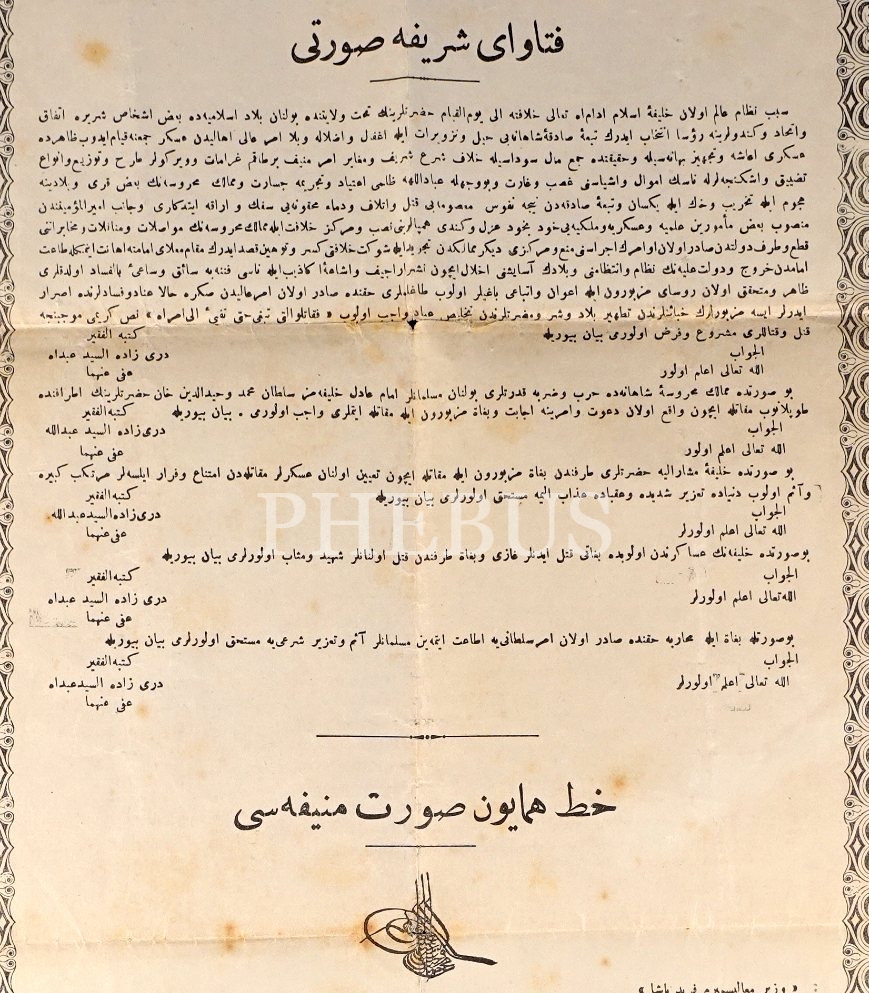 İstanbul´un işgali hakkında yayınlanan fetva, hatt-ı hümayun ve hükümet beyannamesi sureti, 5 Nisan 1336, 27x57 cm